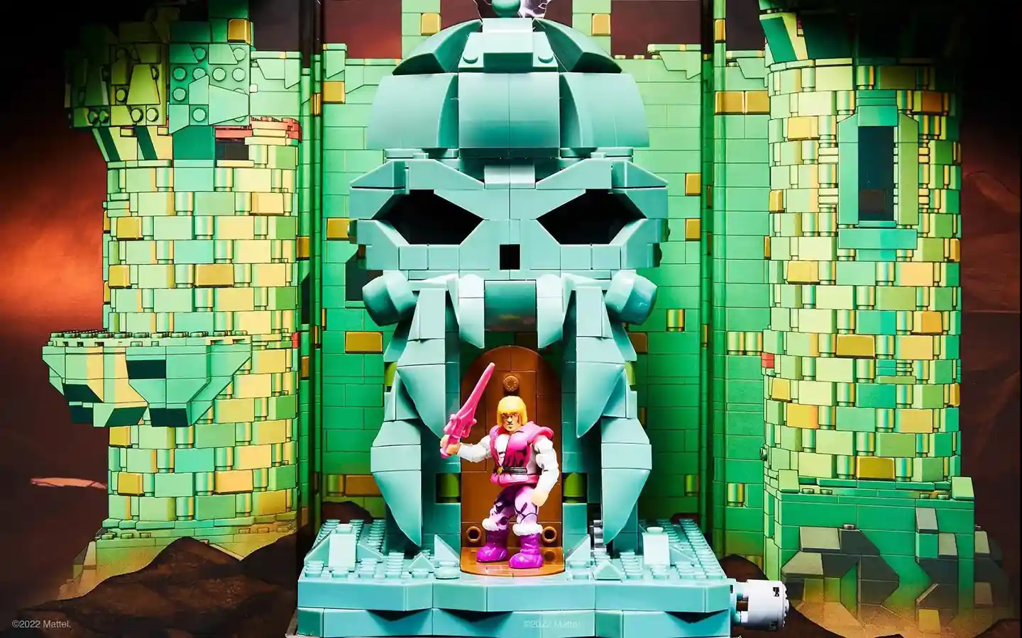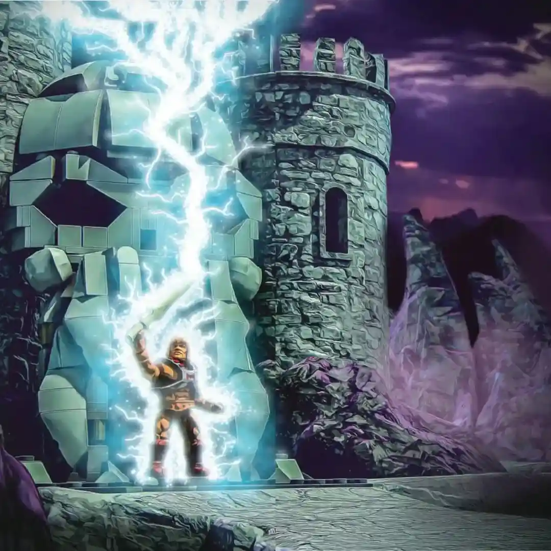 From the unboxing video below, we can see the neat diorama set that this MEGA set comes with making up the side towers of Castle Grauskull. You can also see the “transformation” action feature that works by placing Prince Adam in the Jaw Bridge and turning the lever on the left side, that then flips the platform underneath him over and reveals He-Man, therefore recreating that transformation moment. This is a pretty clever feature by MEGA.