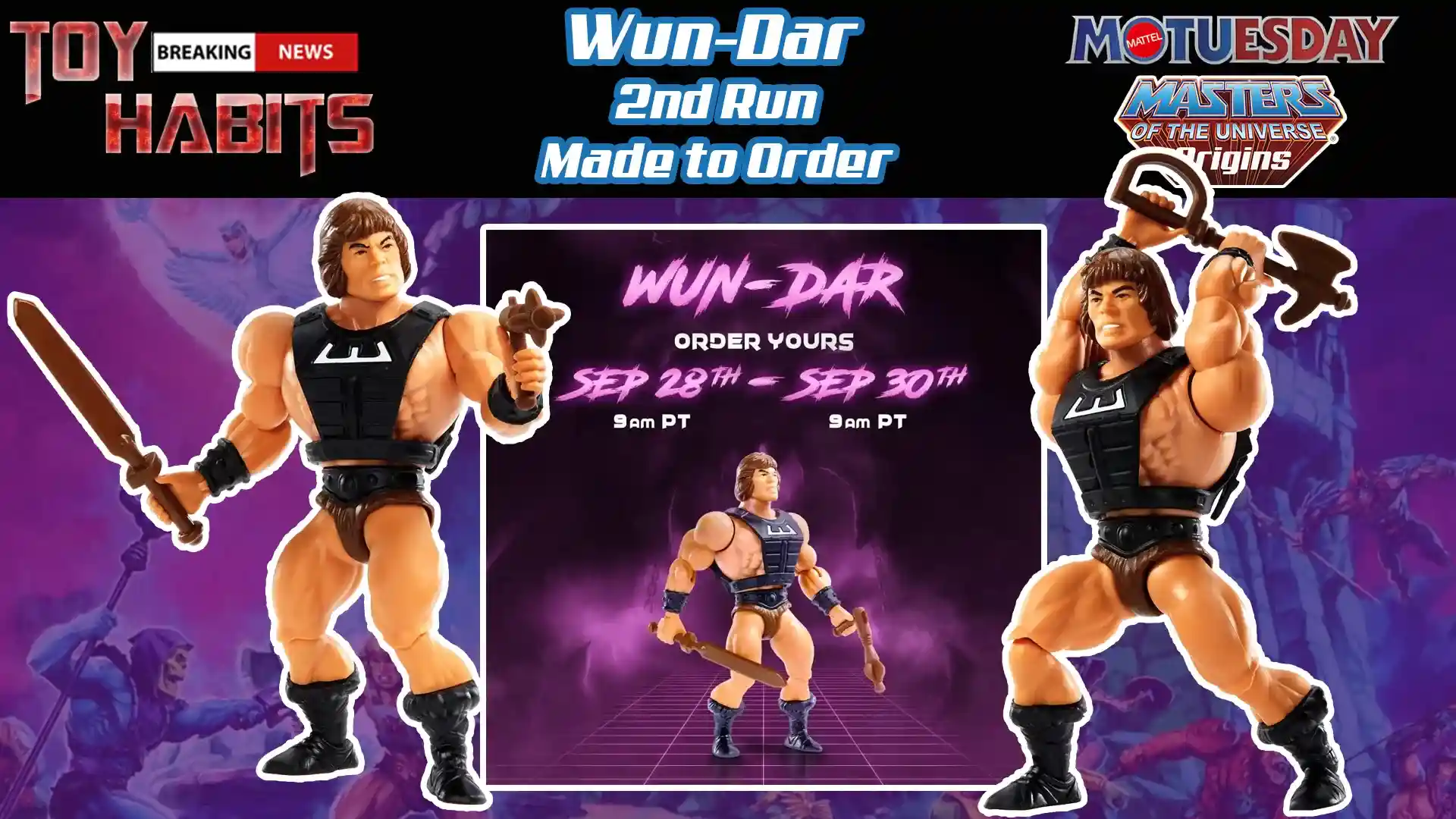 You can order your Wun-Dar on Mattel Creations from 9am PST Sept. 28th thru 9am PST Sept 30th on Masters of the Universe Origins Wun-Dar Figure – Made to Order – Mattel Creations and will list for $18.00, no purchase limits.