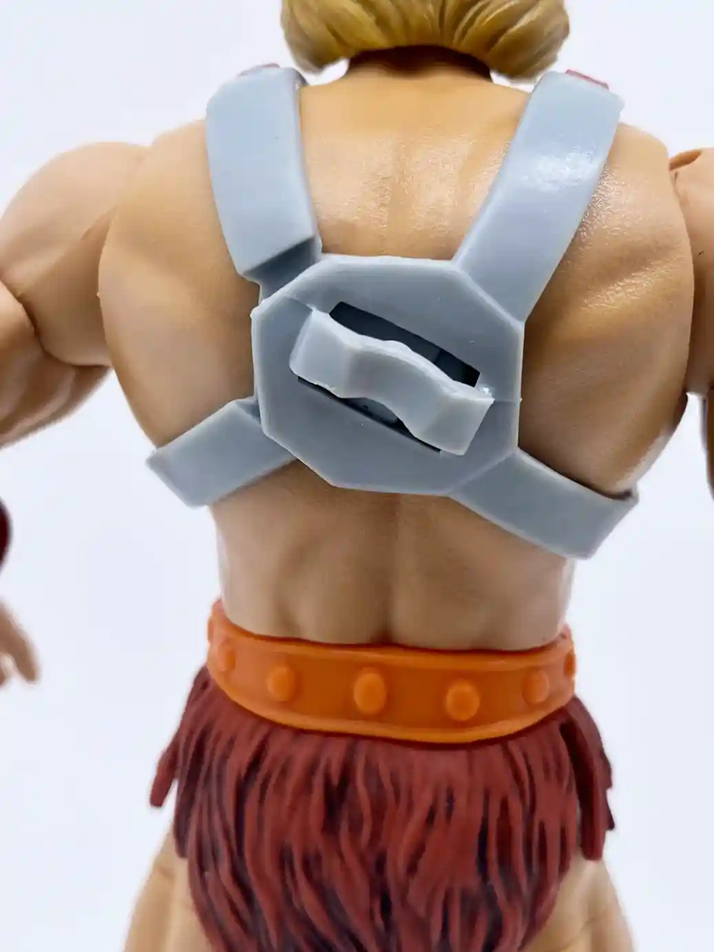 He-Man’s chest is an all new design with that stalkier bulkier look of the vintage action figure. This vast a wonderful design choice for Mattel and really makes this Anniversary He-Man the modern version of the 1982 action figure. With a really light brown wash on his abs and chest, this helps to accentuate his muscles and really highlights the brilliant new torso sculpt. It is a very subtle wash so it’s is balanced perfectly and only added a subtle highlight. His abs have a nice light wash as well to accent his muscles and his ab crunch cut it just under his armor, so it it nicely hidden. His chest armor is a complete homage to the vintage action figure with the same style red cross design and 3 red squares on the shoulder straps. The back of the straps have a new designed clasp which is not my favorite design as it tends to loosen apart a little, but it does have a built in holster for his power sword. His back looks just as expected with a light wash on his muscles as well.