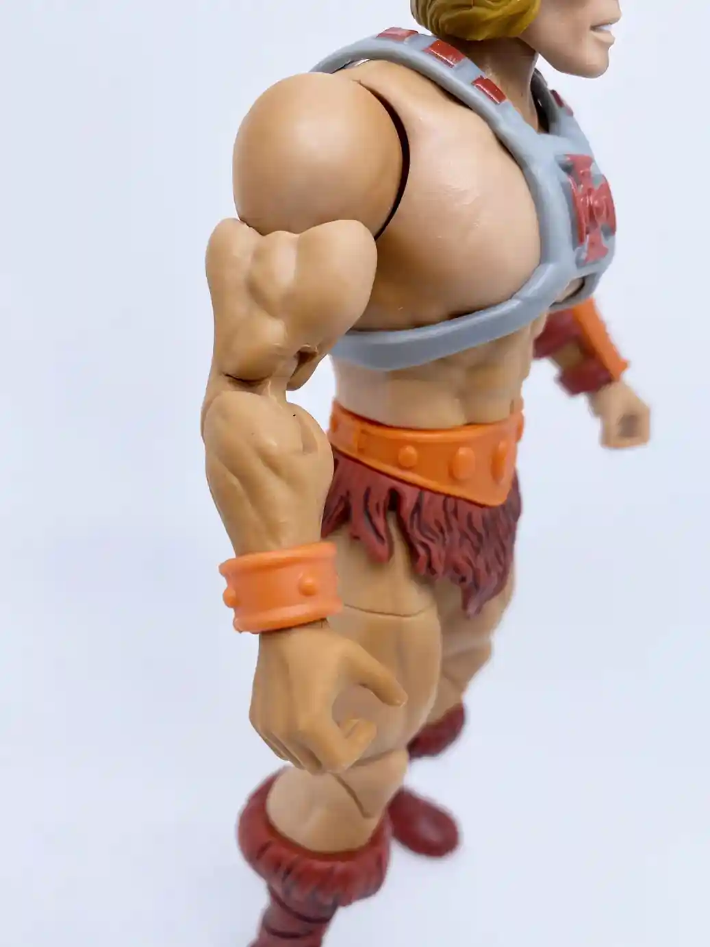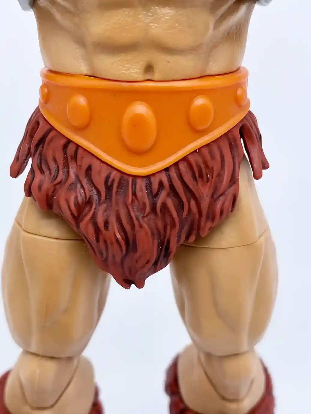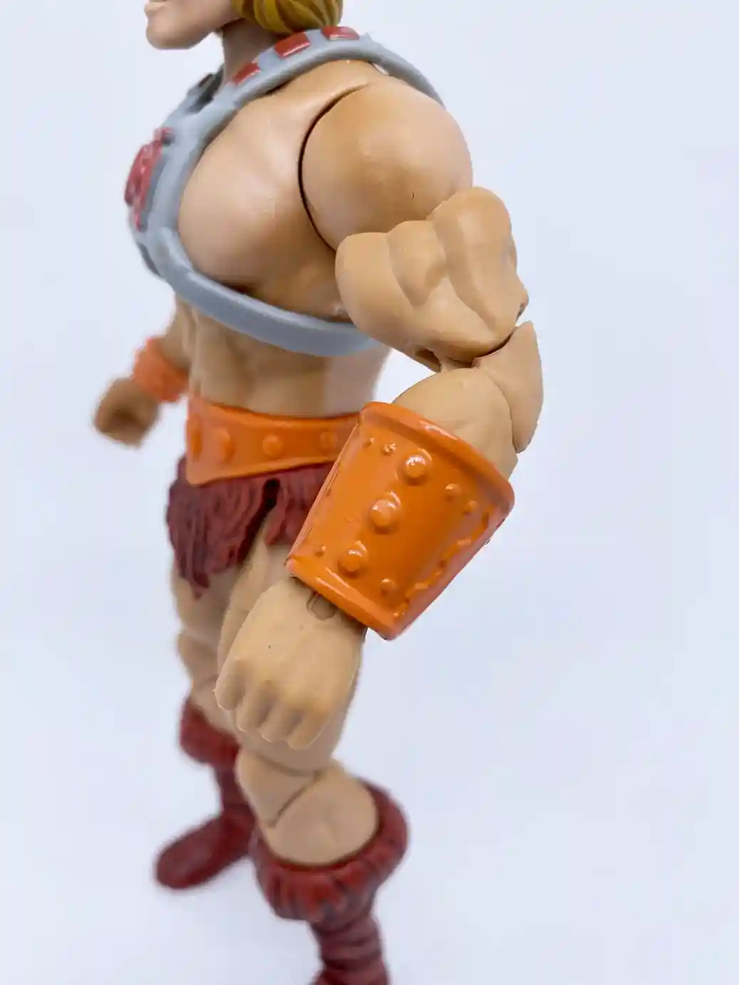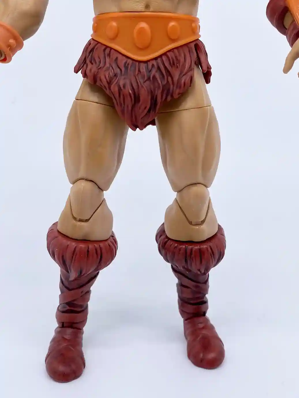 This He-Man figure uses the same arm buck as the previous Masterverse figures, but with the improved skin tone and slight wash, it looks great on him! He is wearing an small orange wrist bracer made of a flat colored plastic on his right wrist. While on his left wrist, he has the larger shinny colored orange wrist bracer with burgundy colored straps. It’s odd that this wrist bracer is a shinny colored plastic while the right one is a flat color. I believe it is because the left wrist bracer is made of a burgundy colored plastic, which the orange part is painted on, but they could have chosen a less glossy paint tone.