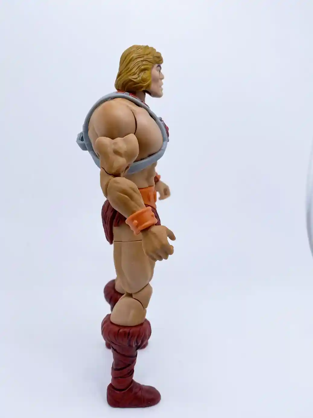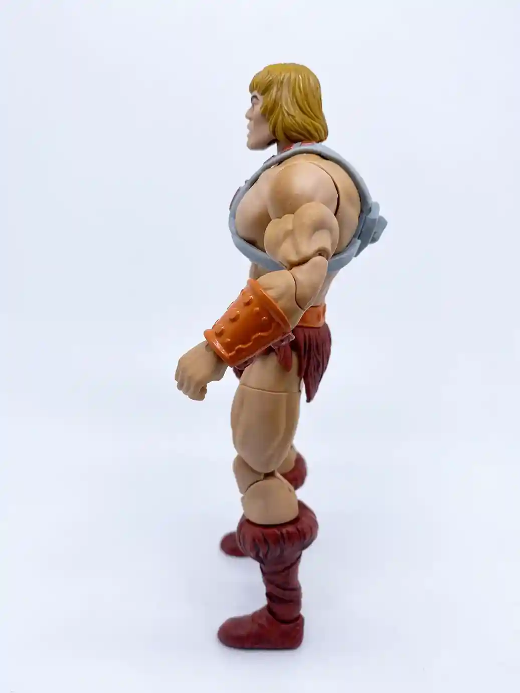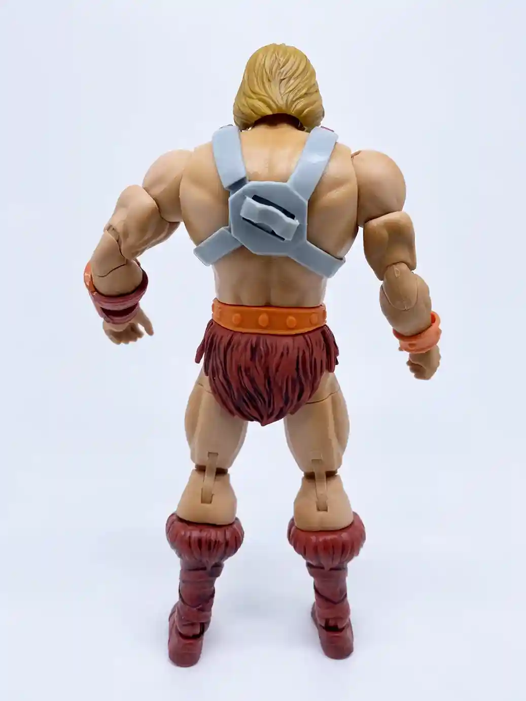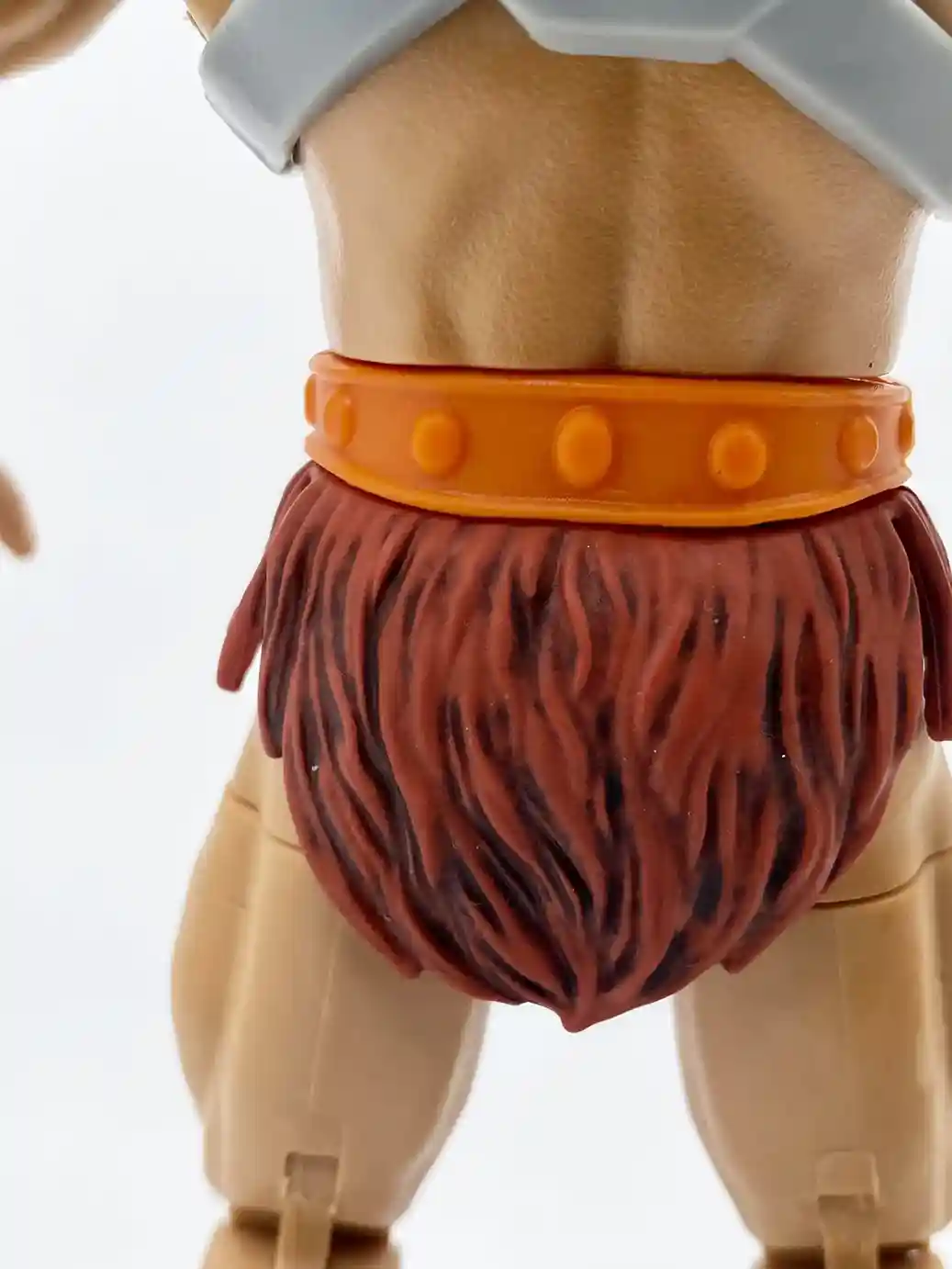 This He-Man figure uses the same arm buck as the previous Masterverse figures, but with the improved skin tone and slight wash, it looks great on him! He is wearing an small orange wrist bracer made of a flat colored plastic on his right wrist. While on his left wrist, he has the larger shinny colored orange wrist bracer with burgundy colored straps. It’s odd that this wrist bracer is a shinny colored plastic while the right one is a flat color. I believe it is because the left wrist bracer is made of a burgundy colored plastic, which the orange part is painted on, but they could have chosen a less glossy paint tone.
