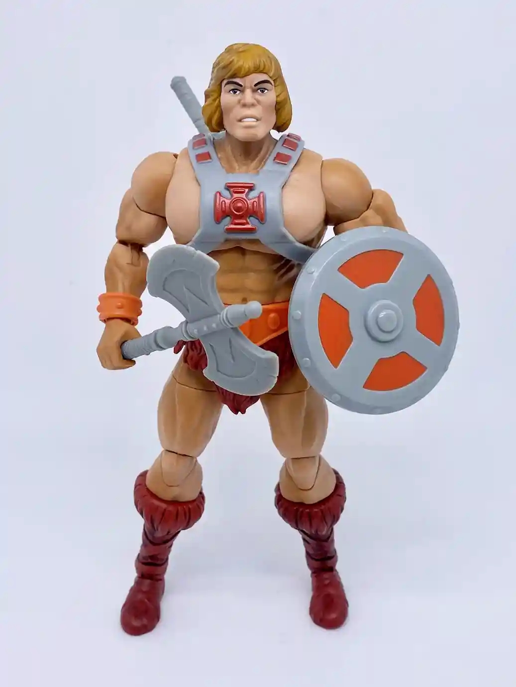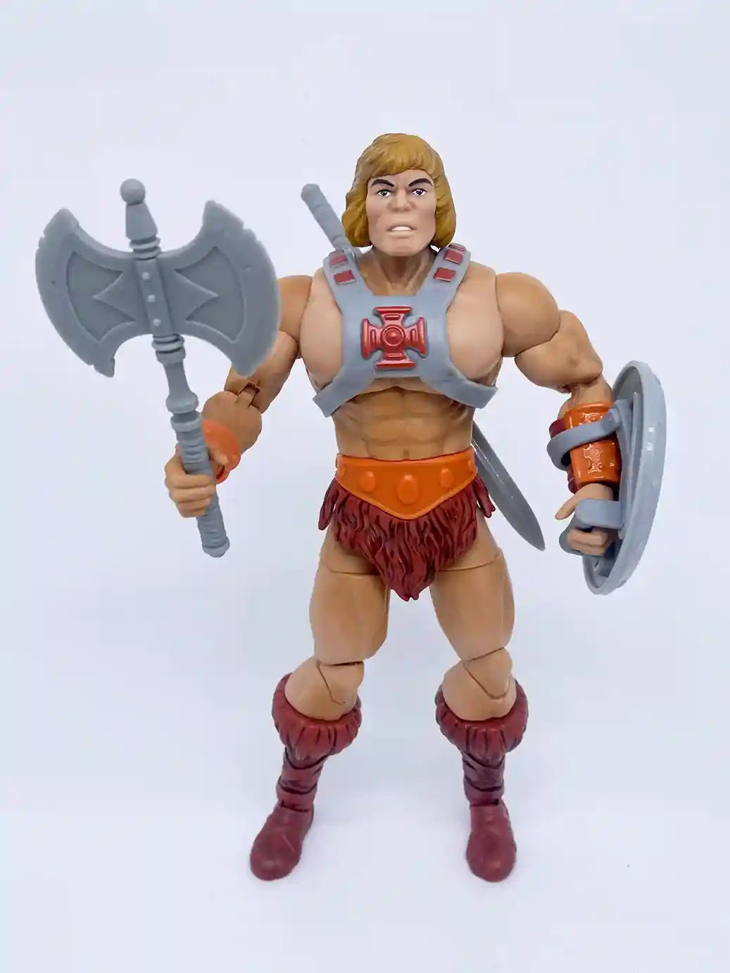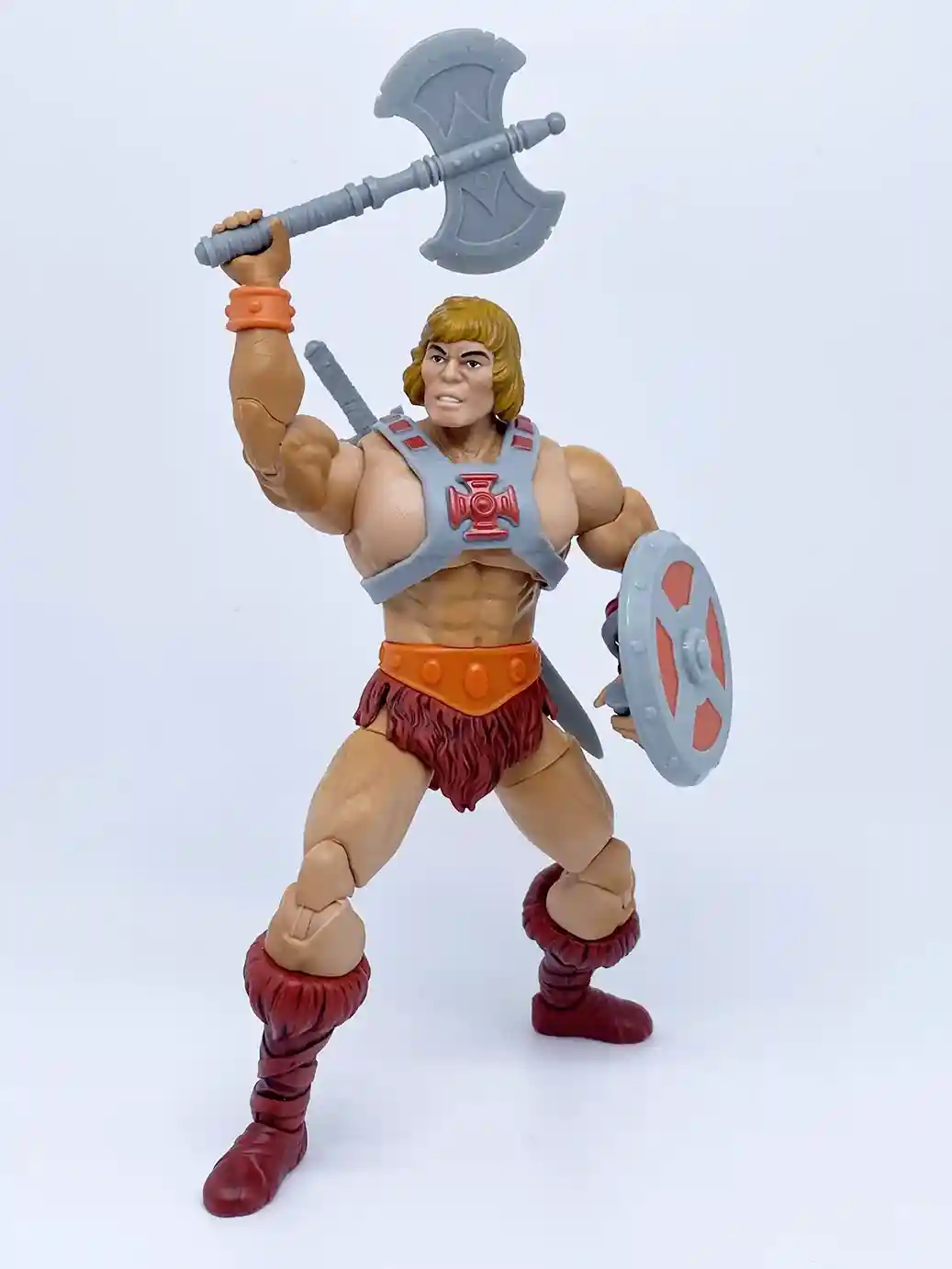 In a complete homage to the 1982 vintage He-Man, the new Anniversary He-Man has a vintage inspired head sculpt, and vintage style chest armor with the classic red cross. This new head sculpt looks amazing! The recent modern versions of He-Man’s head sculpts have all been a bit off, but this Anniversary He-Man head sculpt absolutely nailed the look of his vintage counterpart! His chest looks to be a new sculpt as is resembles that bulkier stalkier look of the vintage He-Man figure. The loin cloth and boots are in that classic burgundy color like the vintage. He shares the same wrist bracers, belt, loin cloth and boots as the current Masterverse Revelation He-Man but in vintage inspired colors. His arm bracers are in an orange color with burgundy wrist straps. He-Man’s skin tone is a much better more peach skin color, which is a vast improvement from the yellow toned Masterse Revelation He-Man. Shown below is the Masterverse Anniversary He-Man with all his accessories. He includes a vintage style power sword, axe and shield and also 2 swappable hands.