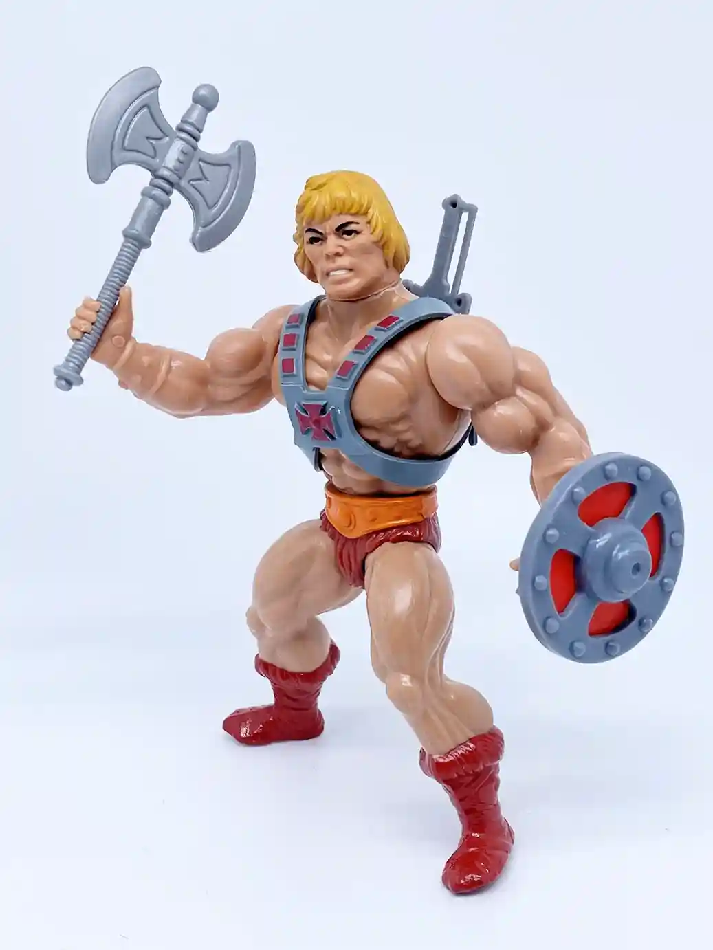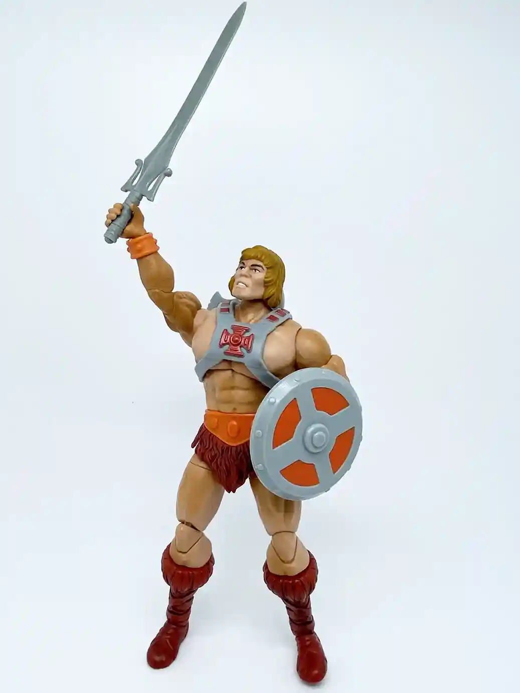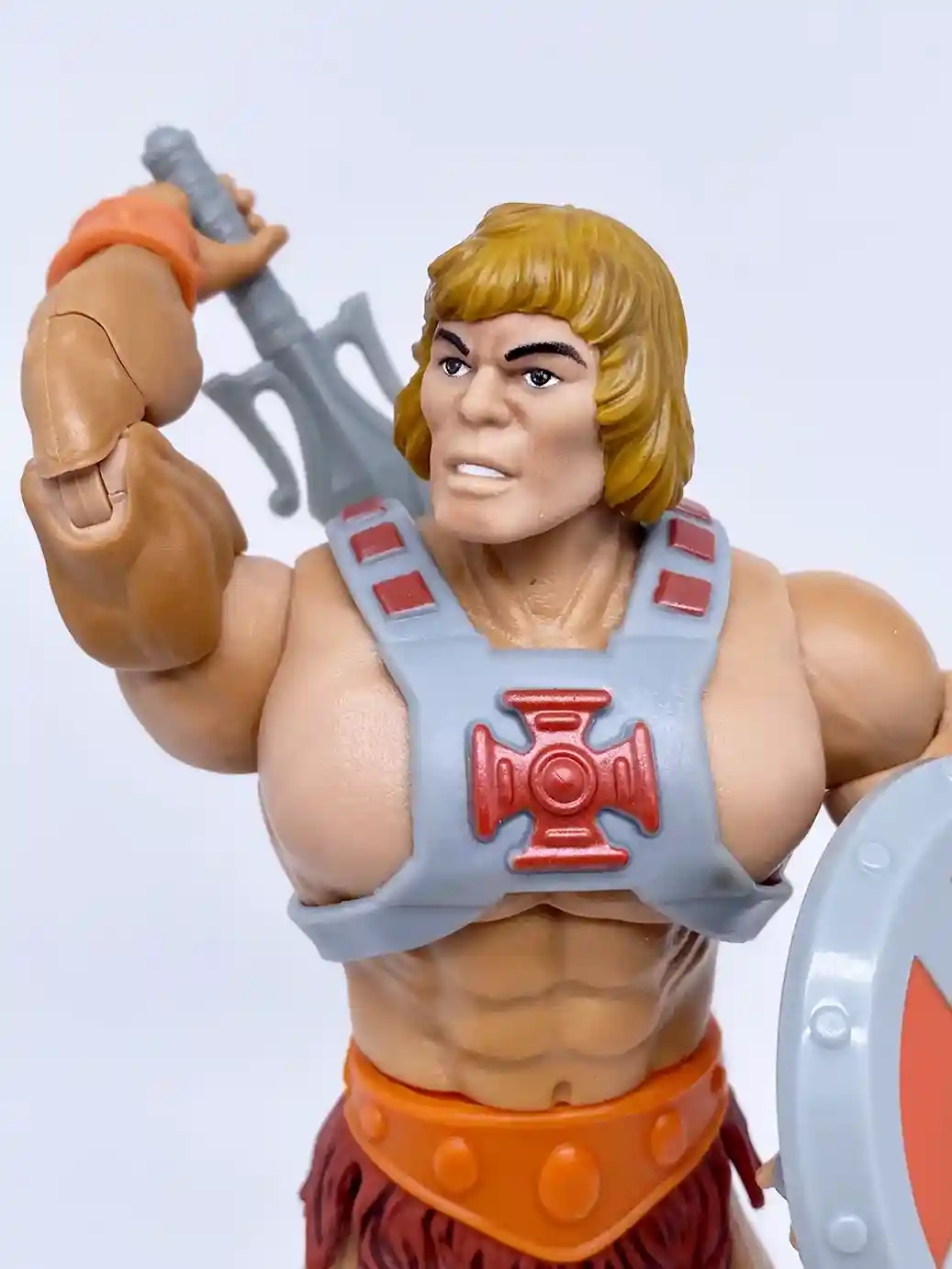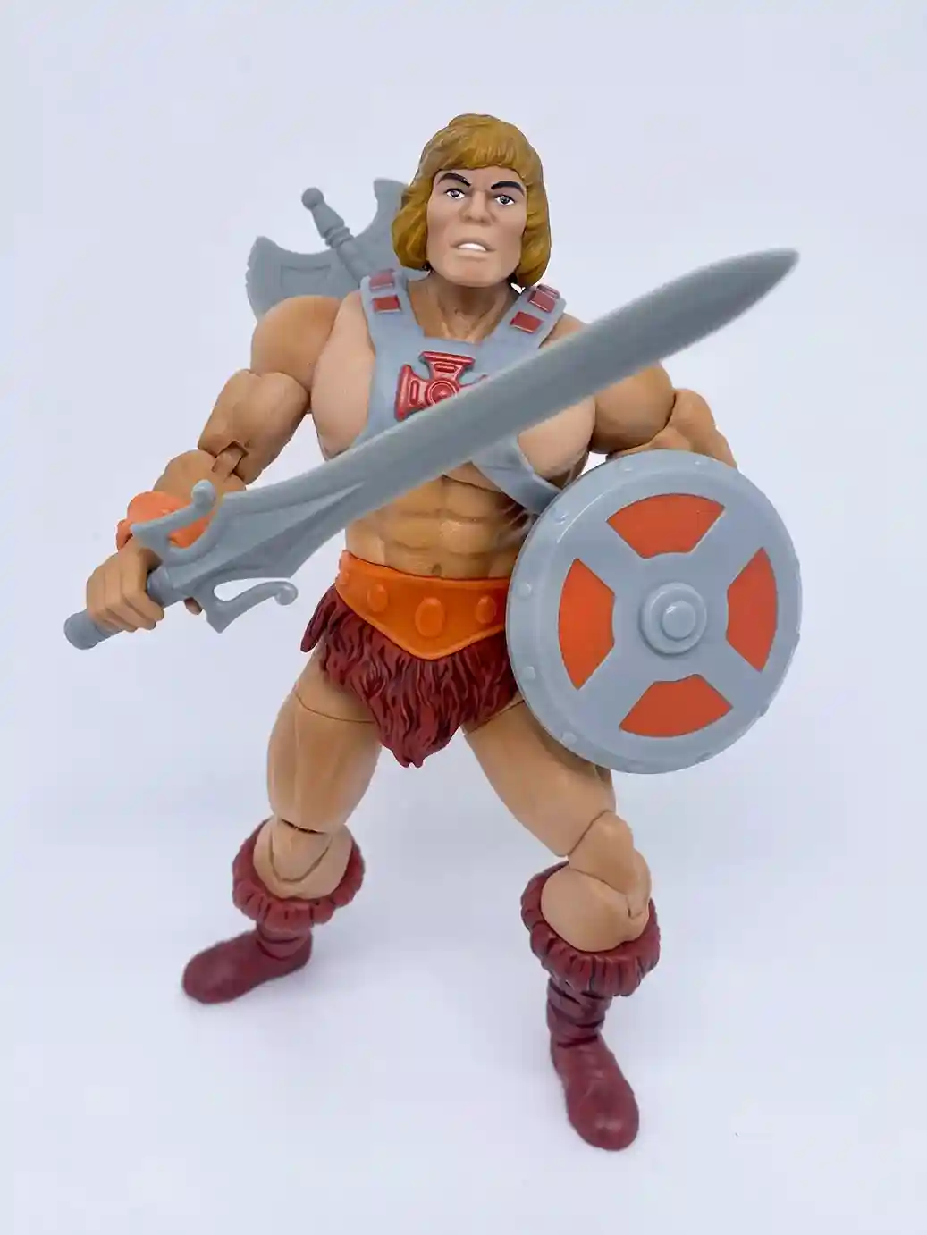 In a complete homage to the 1982 vintage He-Man, the new Anniversary He-Man has a vintage inspired head sculpt, and vintage style chest armor with the classic red cross. This new head sculpt looks amazing! The recent modern versions of He-Man’s head sculpts have all been a bit off, but this Anniversary He-Man head sculpt absolutely nailed the look of his vintage counterpart! His chest looks to be a new sculpt as is resembles that bulkier stalkier look of the vintage He-Man figure. The loin cloth and boots are in that classic burgundy color like the vintage. He shares the same wrist bracers, belt, loin cloth and boots as the current Masterverse Revelation He-Man but in vintage inspired colors. His arm bracers are in an orange color with burgundy wrist straps. He-Man’s skin tone is a much better more peach skin color, which is a vast improvement from the yellow toned Masterse Revelation He-Man. Shown below is the Masterverse Anniversary He-Man with all his accessories. He includes a vintage style power sword, axe and shield and also 2 swappable hands.