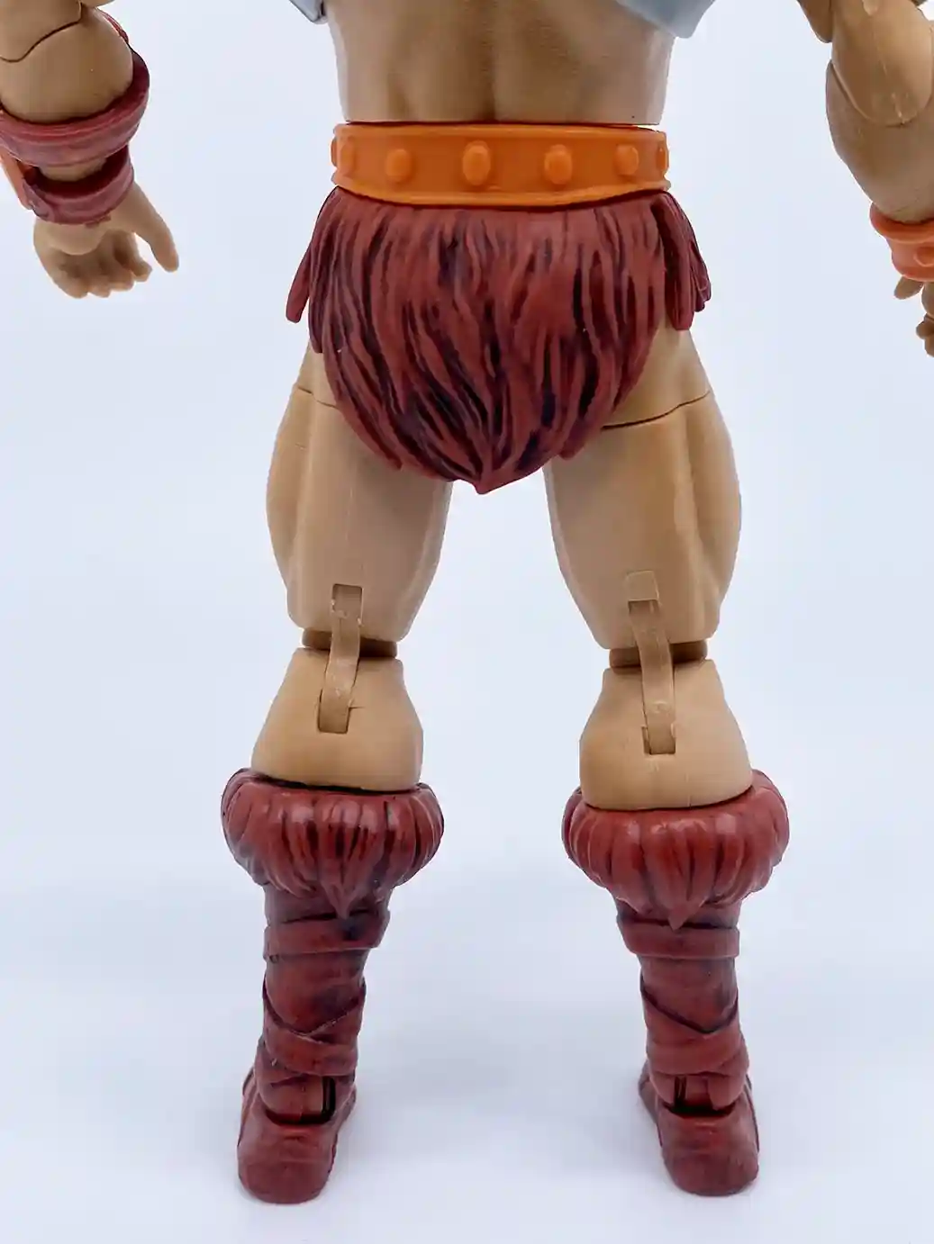 The design of the 40th Anniversary Masterverse He-Man’s waist follows the same bulk style of previous Masterverse figures, but with those vintage style colors. His belt is a flat orange plastic color with circular patterns on it. His loin cloth is the same longer loin cloth of the Revelation version of He-Man but in a burgundy color that matches that of the vintage action figure. It also has a nice brown wash on it that helps to accentuate the details in the loin cloth. All in all it is done very well.