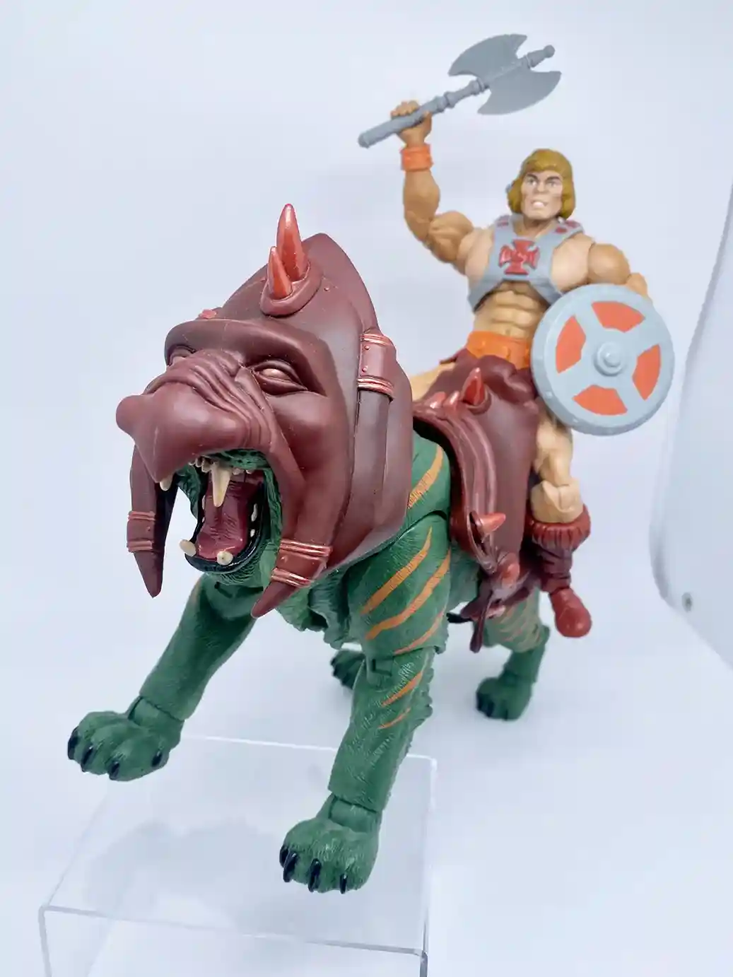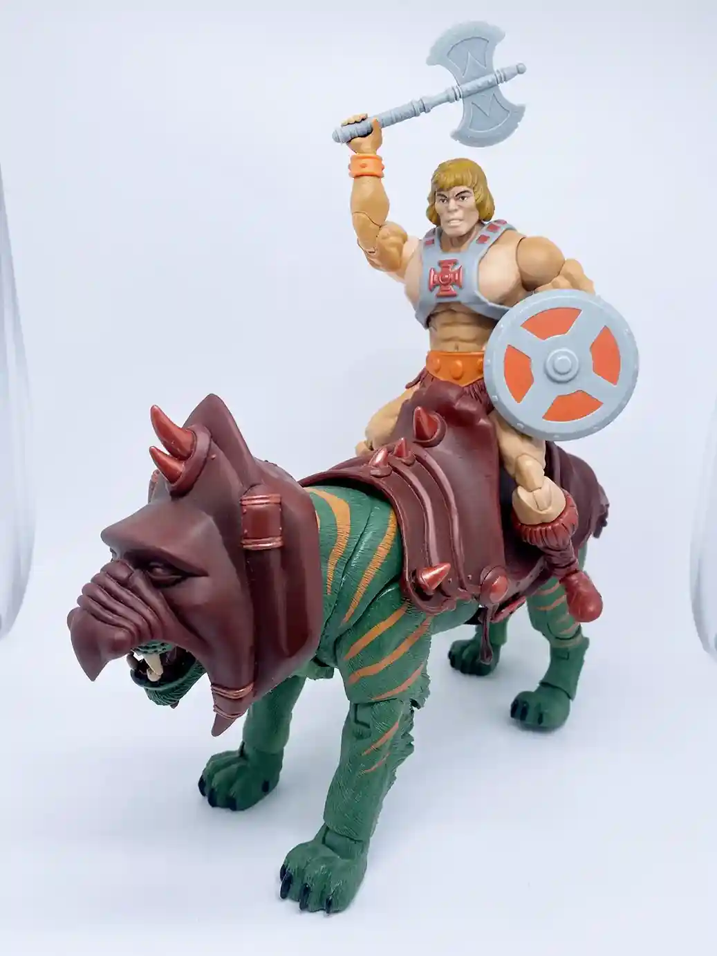 Mattel’s 1982 He-Man action figure shown below in classic form riding on Battle Cat! The first time I sat He-Man on Battlecat and saw how absolutely AMAZING he looked sitting on there, it took my breathe away! I am sure we all hold a special place in our hearts for the Vintage 1982 He-Man action figure! Now getting to see the new Masterverse He-Man on Battlecat ( in this case we used a Classics Battlecat), I get those same feelings of nostalgia!