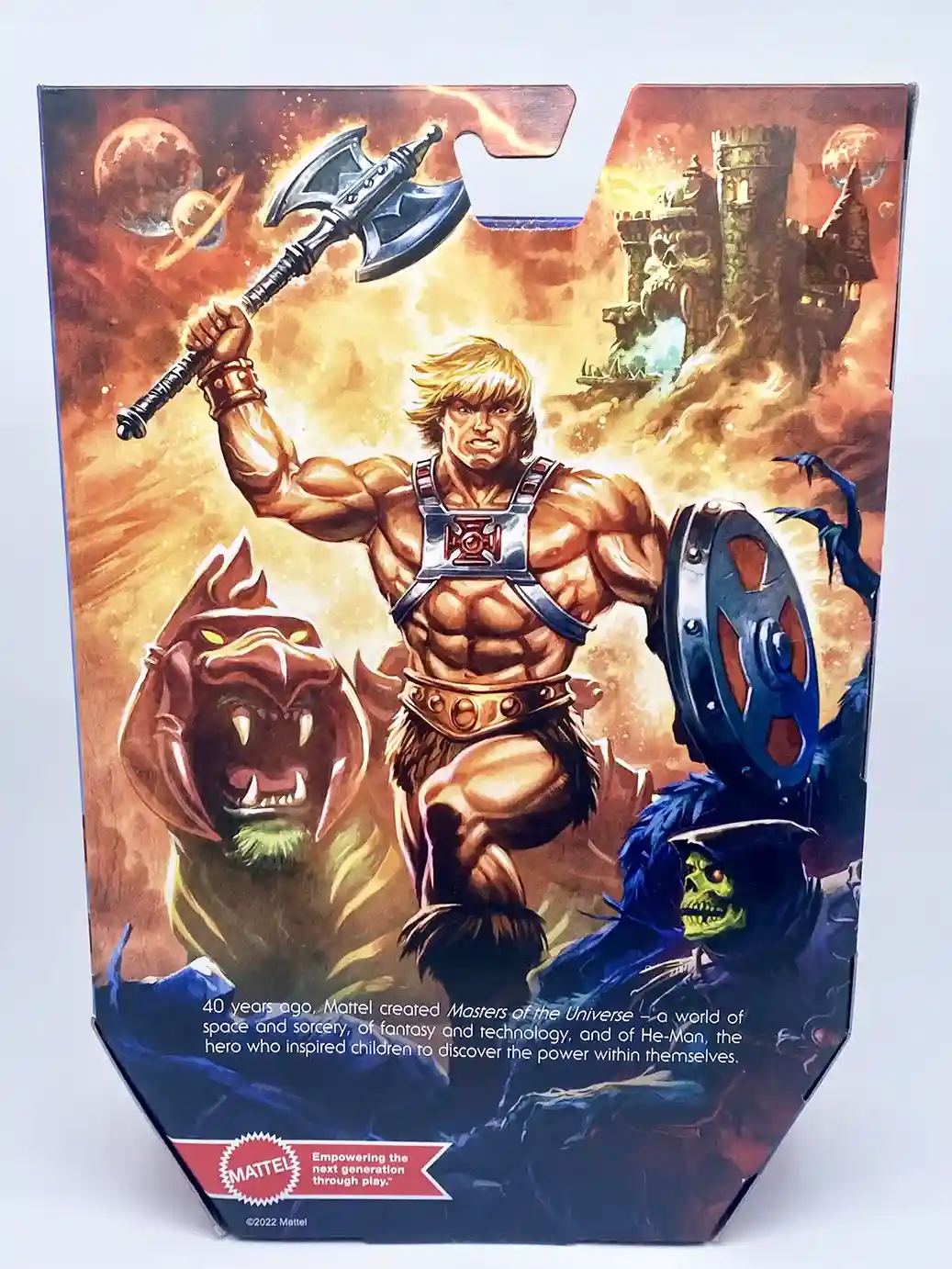 He-Man was originally released by Mattel in 1982. Shown below is the Vintage He-Man Master of the Universe figure as he appeared on his vintage card back! You can see the blue sky, red rock burst and classic Masters of the Universe logo that were all used on the new Masterverse Anniversary Edition He-Man!