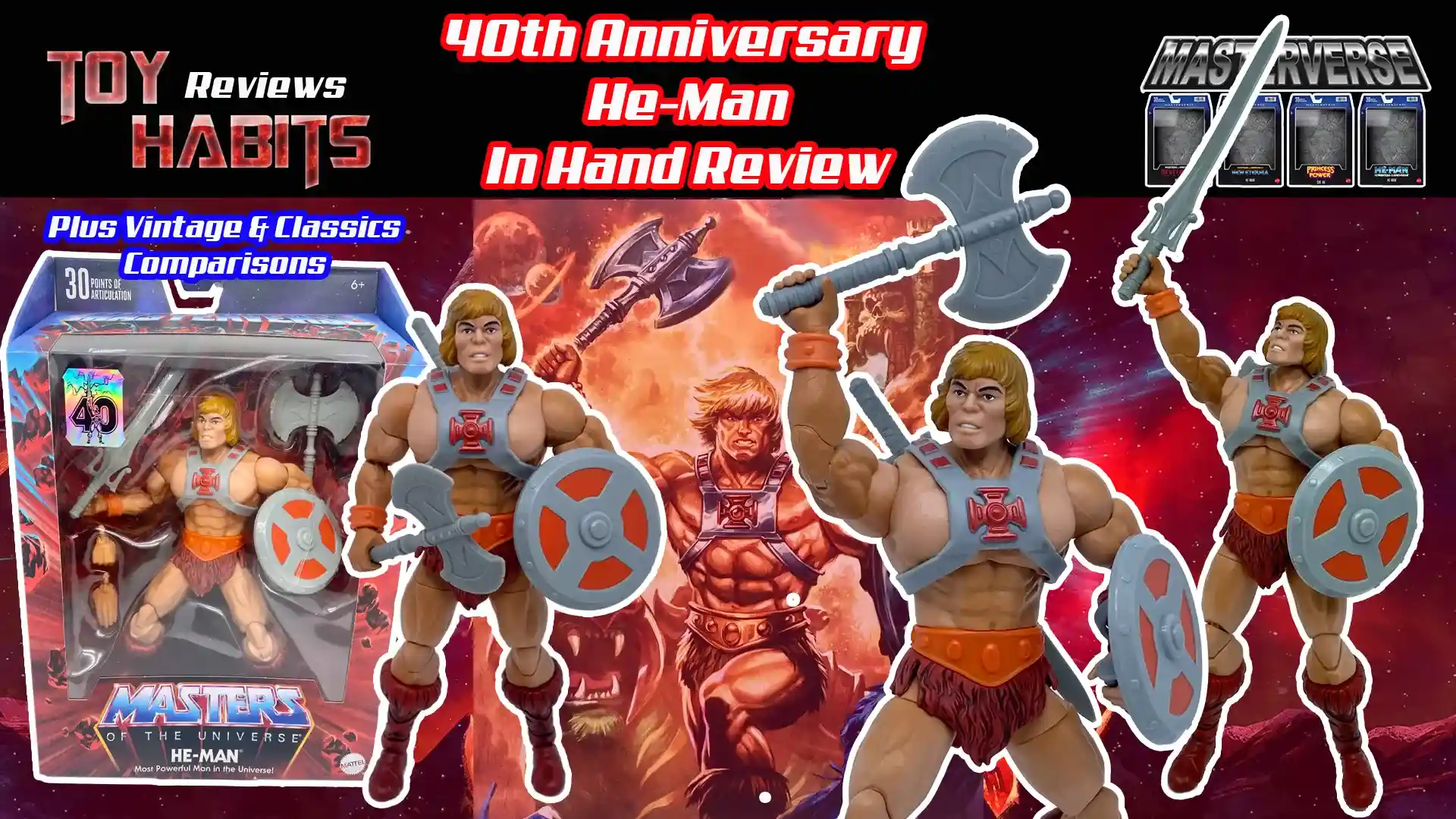 Celebrating 40 years of Masters of the Universe, the most powerful man in the Universe returns in truly glorious fashion with this new 40th Anniversary Edition Masterverse He-Man in a stunning homage to the 1982 Vintage He-Man action figure! This is hands down the best He-Man figure to date and pays tribute to the true Origins of the character and his vintage design. This standard retail release is everything we could have wanted in a modern He-Man figure! We got our hands on him, so let’s take a deep dive look at the strongest man in the universe! I can’t tell you how excited I am for this one!