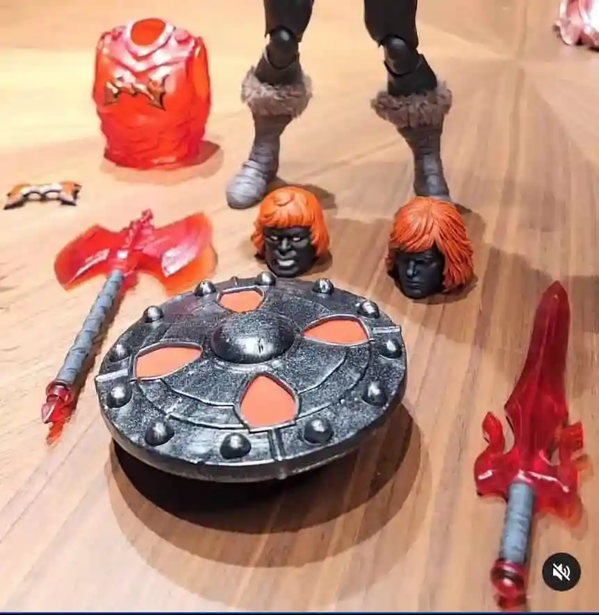 Anti Eternia He Man 200x Mondo MOTUFest Power Con 2026 BBTS Exclusive comes loaded with accessories, including four swap-out head sculpts each sporting red hair with different expressions, a translucent red power sword, a red axe, and a translucent shield with a metallic silver and red cross design. He also includes two sets of alternate hands in black, along with red wrist cuffs and a silver harness with a red emblem at the center.