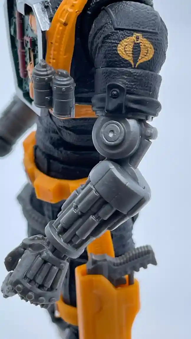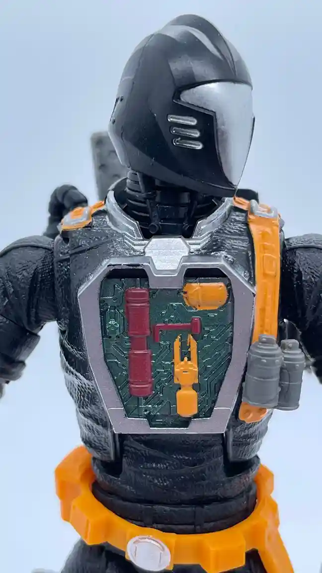 Now the arms are symmetrical meaning they are the same on both sides so let’s just take a look at the left arm and start off with the amazing cobra symbol on the side. The main difference between the vintage figure and this one is the Cobra sigil is the placement is on the side of the arm versus the front. I liked the placement of the sigil on the front in the vintage figure because you can always see it. I Love the look of clothing with the folded sleeve and a button and if you think about it, the BAT is a robot so it does not need clothing but maybe Cobra Commander had save money and just make cloth uniforms instead of providing extra protection. He has exposed forearms with that look like they have working pistons and rods and the other side is covered, creating a unique look.