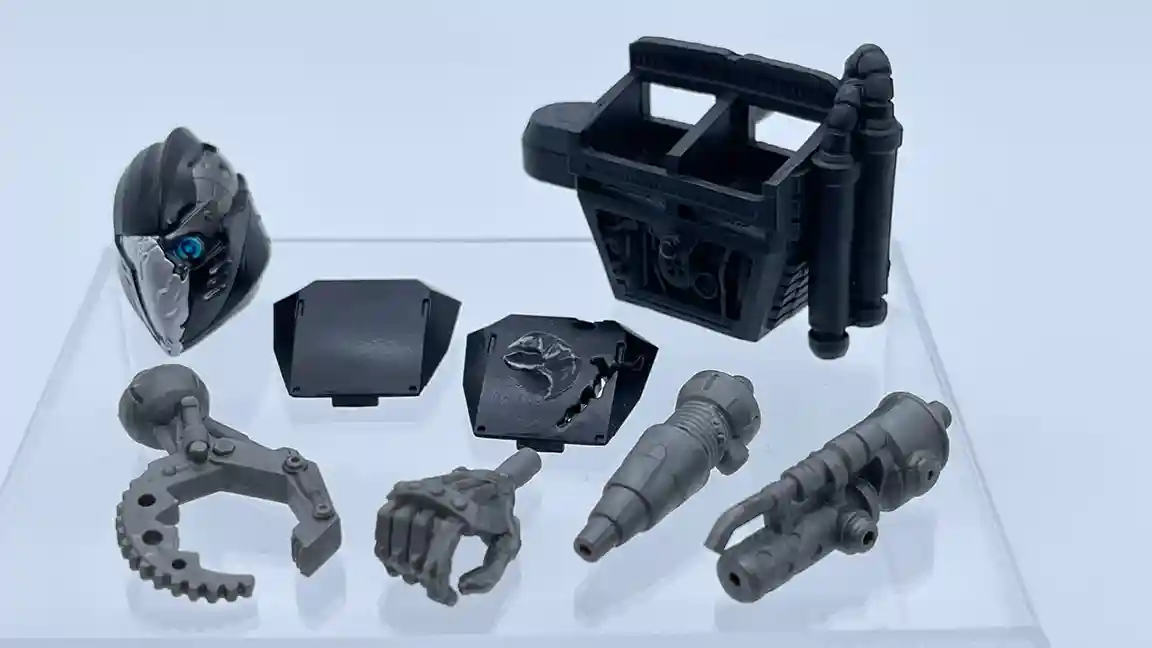 The weapons and accessories pack out is off the charts! Let’s take a look at all of the parts, which include a backpack, pistol, two chest plates (regular and battle damaged), and extra battle damaged head sculpt, and the following attachments: hand, laser, claw, and flamethrower.