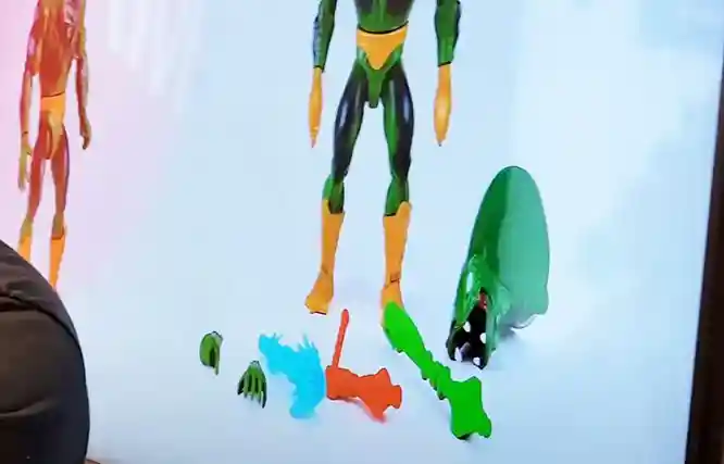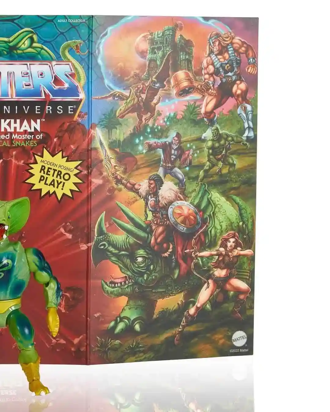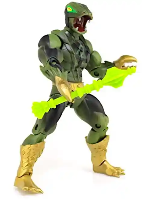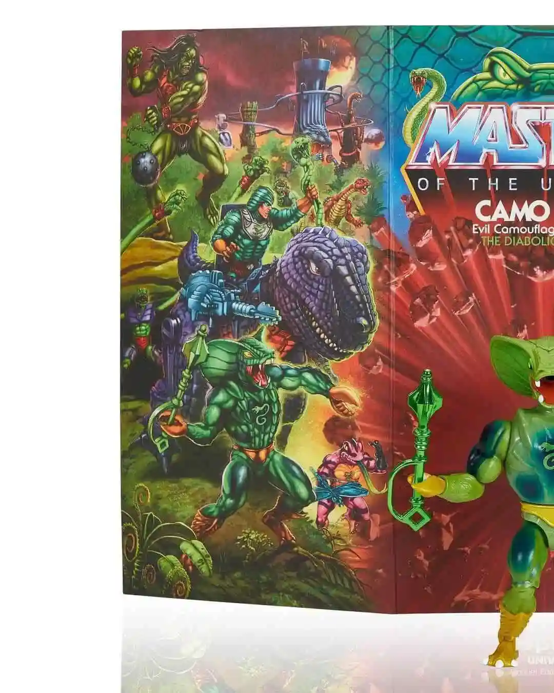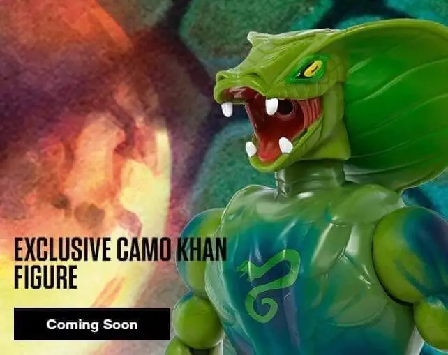 This new Camo Khan Figure looks absolutely amazing! Collector friendly where you can slide out the card and unfold it into a trifold card which reveals a really nice diorama. The trifold card features the backstory on Camo Kahn and how he came into the Masters of the Universe. The card also sports the Rise of the Snake Men Origins theme, which is the first card art to feature this (#spoileraltert)! Camo Kahn was a variant that came with lobster hands like Clawful. He has his regular vintage style head that we all know from Kobra Khan and also the flared Cobra head that we first saw from the Masters of the Universe Classics line two swappable heads.