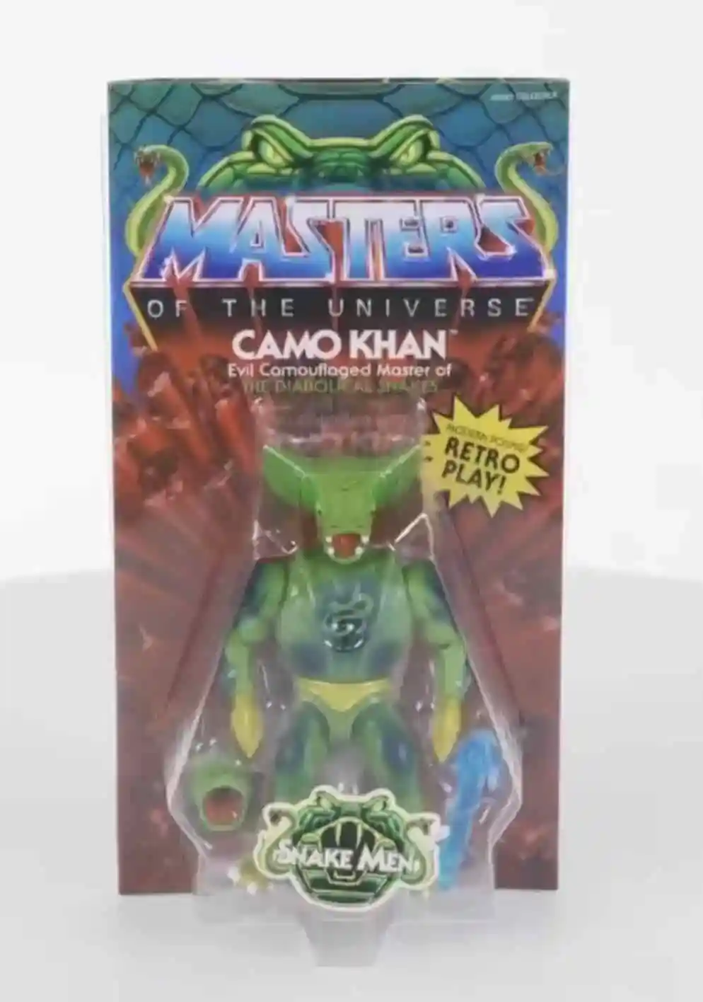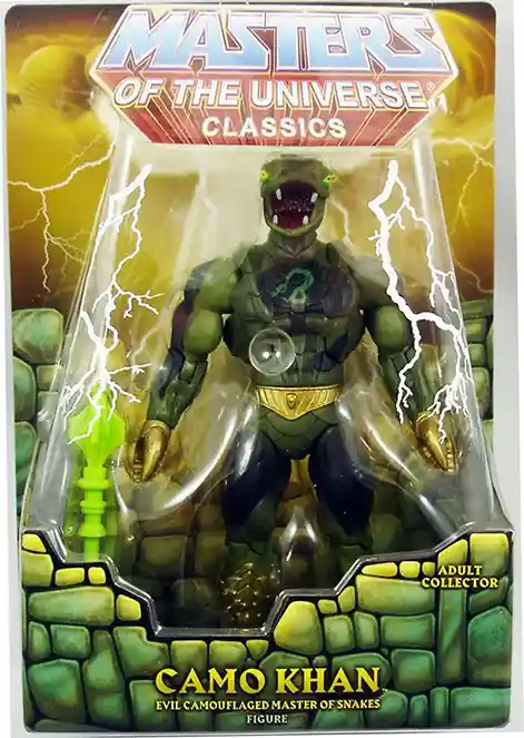Camo Khan breeds evil into our MOTU line. Inspired by the popular Kobra Khan Camuflado collectible figure from 1987 released in Argentina, we’re bringing this sly villain back. Enchanted by Skeletor, Camo Khan has new powers of camouflage, a more potent hypnotic mist, and the mystical Golden Claws of Crushing. Harness his new powers with swappable hands, heads, weapons, and a spray accessory.