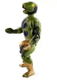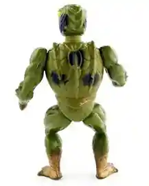 Interestingly, there was a version of Kobra Khan that did have the snake symbol on his chest– a variant made by Argentinian manufacturer Top Toys, called Kobra Khan Camuflado. Known as Camo Khan to many fans today, the figure had a green and black camouflage style paint job, gold boots and belt, and strangely, Buzz-Off’s clawed arms. He was given Clawful’s green mace as a weapon.