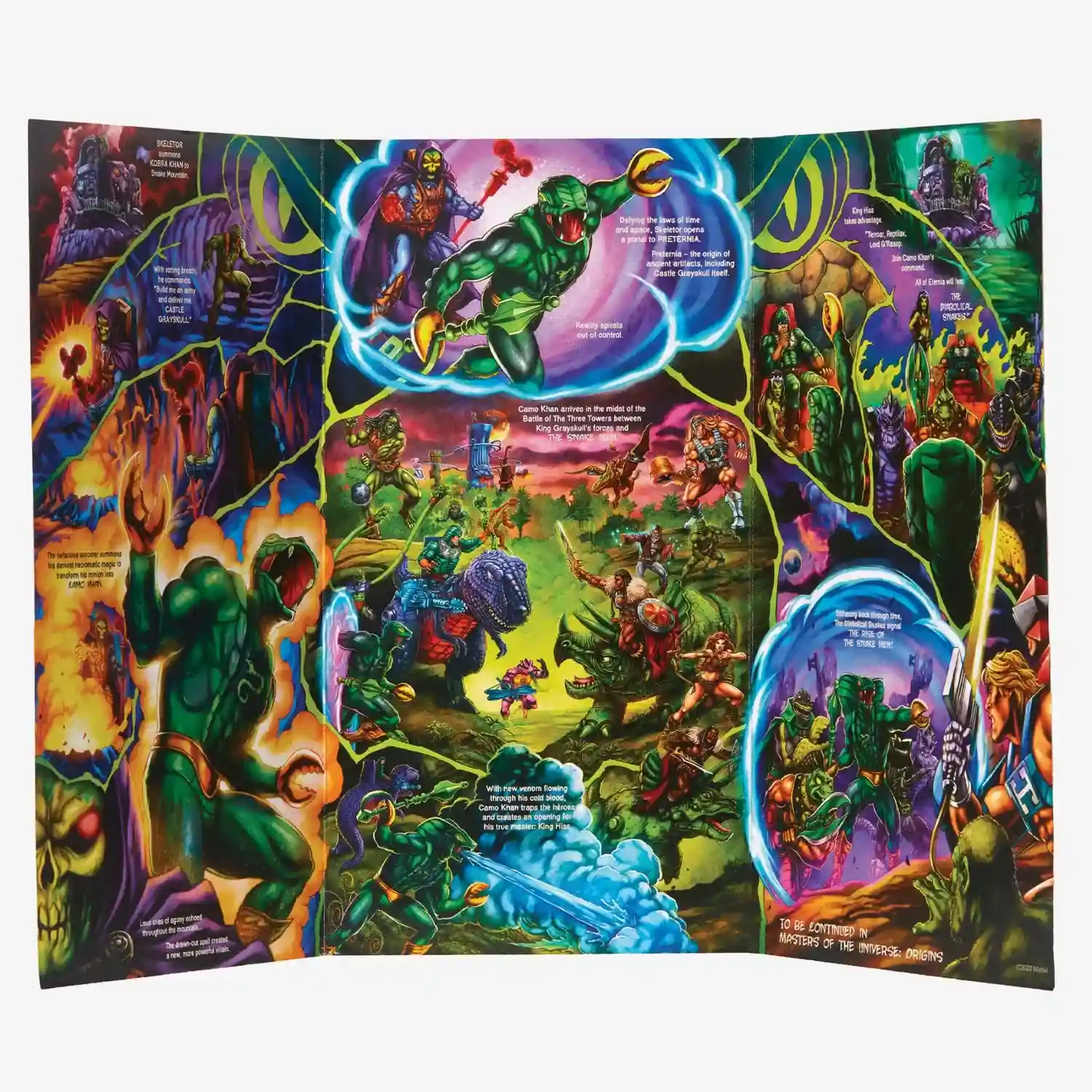 The Mattel Creations exclusive Camo Khan card back is FILLED to the brim with amazing character, creature and playset teases! You can see the incredible world of Preternia illustrated on the back of Camo Khan’s card back. We can see Laser Light Skeletor along with the recently announced Snake Mountain in the background. We see the host of Powers of Grayskull characters from the front card art as well. Here we see King Hiss illustrated again sitting on a throne with a host of other henchmen. Also Camo Khan is shown coming thru a magical portal with Terroar and Lord Gr’asp, approaching Laser Power He-Man and Moss-Man. Prominently featured on the Camo Khan card back artwork are a ton of Powers of Grayskull characters. We are now several years into the line, and maybe it’s about time we dive deeper into this exciting subline. A line that only had a few characters produced back in 1988, was never fully developed by Mattel because the line’s popularity was dying out by then. It included fantastic new characters, giants and the world of Preternia filled with robotic dinosaurs! It would be a dream come true if Mattel were to build out the Powers of Grayskull line!