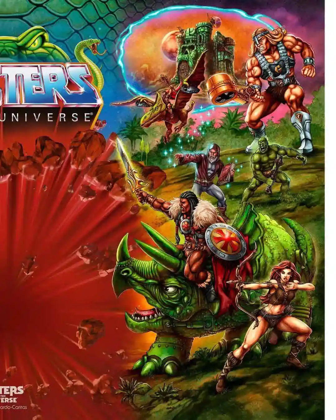 With absolutely stunning artwork by Axel Gimenez, the Camo Khan cardback features all sorts of exciting MOTU characters. We can see Lazer Light Skeletor in the background, along with a host of Powers of Grayskull characters. We have Megator, King Hiss riding the Tyrantisaurus Rex. We can also see Tung Lashor who was also teased to be coming to the Origins line! King Grayskull is riding Bionatops, and as we saw on the Eternia display, there was an Origins version of King Grayskull as well! Then we see teases of Moss Man and Sharella, as we covered in Wun-Dar Card Art Teases New MOTU Origins Characters. Also pictured is Eldor, Squeeze and Tytus as well! There are so many characters here that we have either predicted thru previous card art teases or haven gotten leaks on, so it is very exciting to see these characters on this artwork!