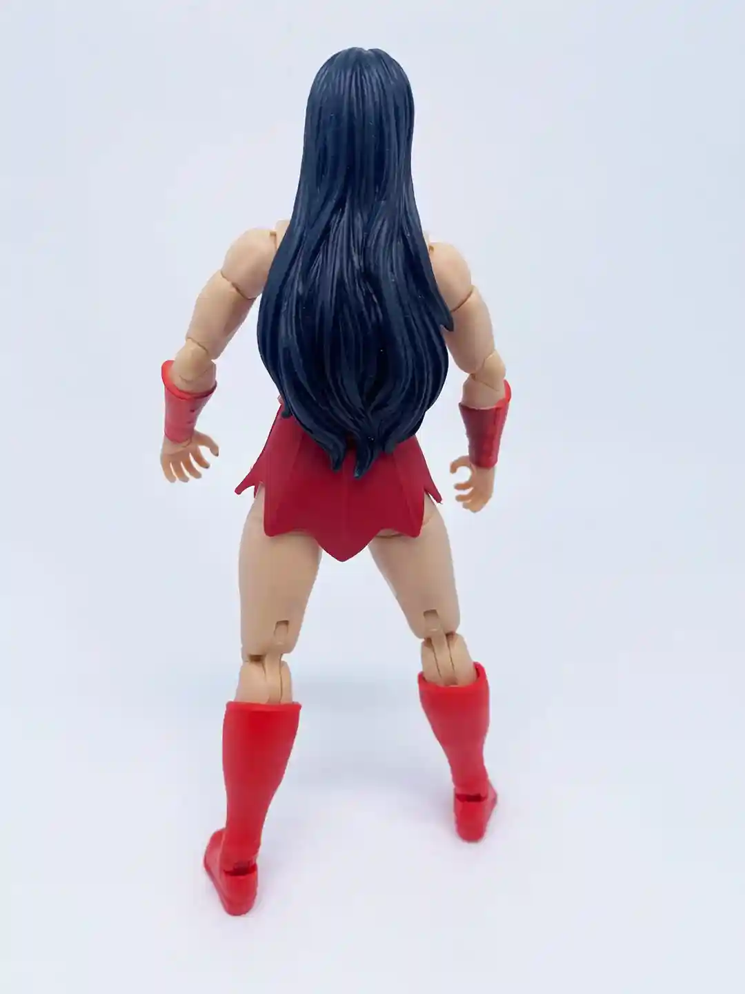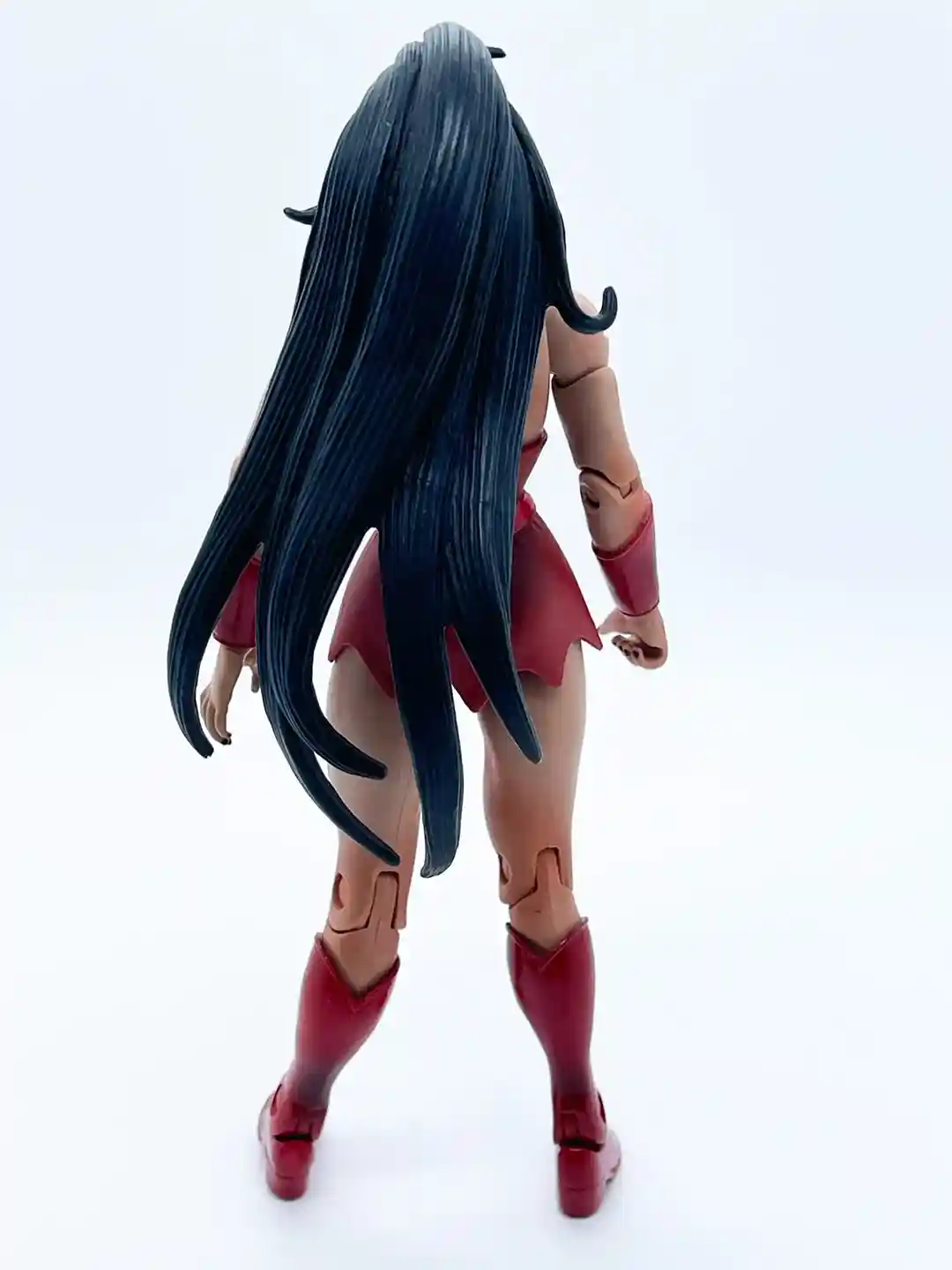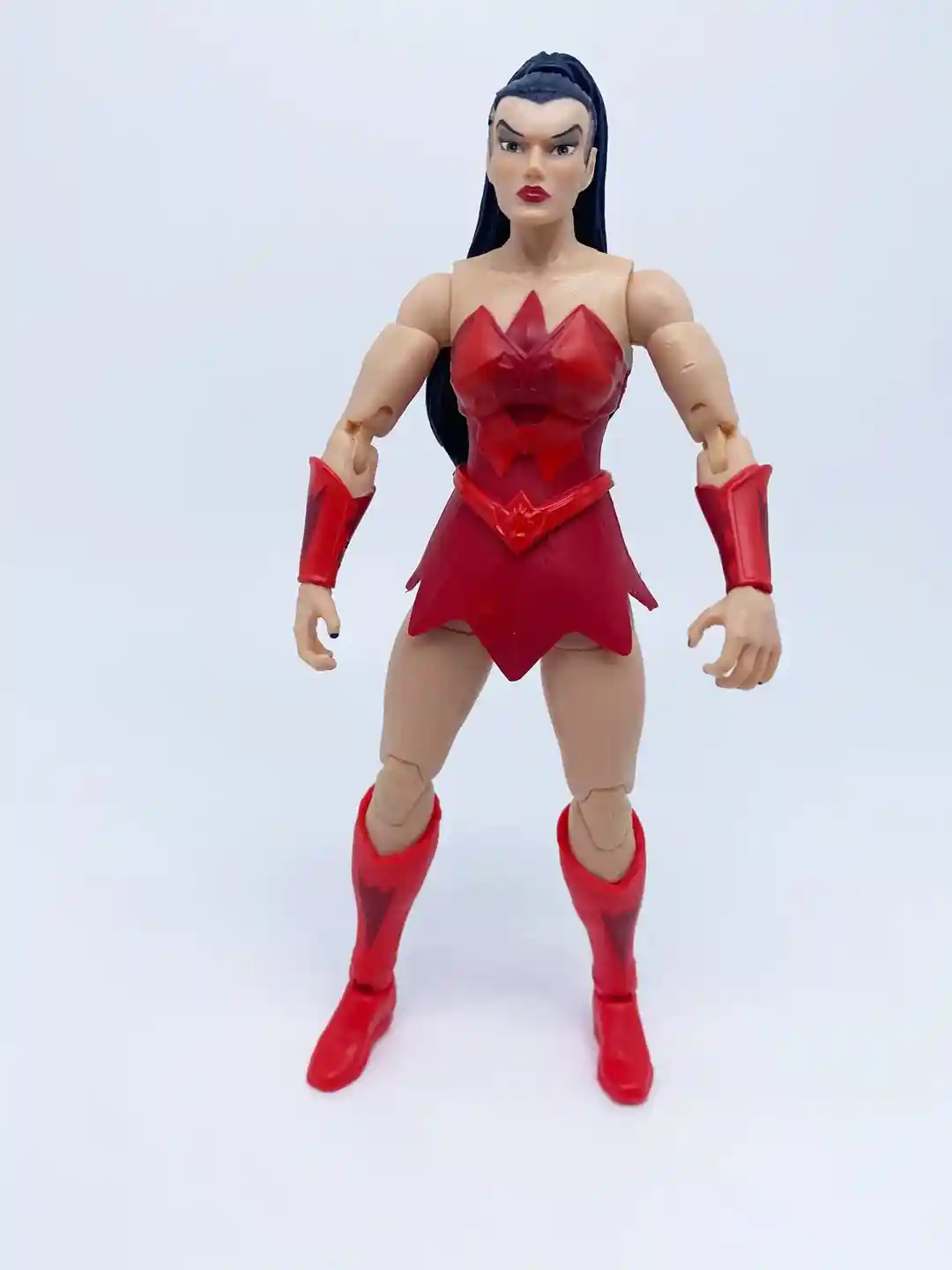 The figure really leans into the Filmation version of Catra from an animated and concept art perspective. As with many of the PoP figures, there is not a lot to say about her clothing as there is not much of it! She is wearing her classic red mini dress with a Horde symbol in the middle of her chest and a Horde belt! The official images are a little misleading as the finishes on her chest and belt detail looked shiny but the figure, in actuality, has more of a matte finish with a small sheen to the features on her chest and belt, which are a different shade of red. As we see more and more PoP figures revealed (like Shadow Weaver and She-Ra), the Masterverse line keeps upping their game with supplying soft goods capes with their Princess of Power figures, which is a very nice touch.