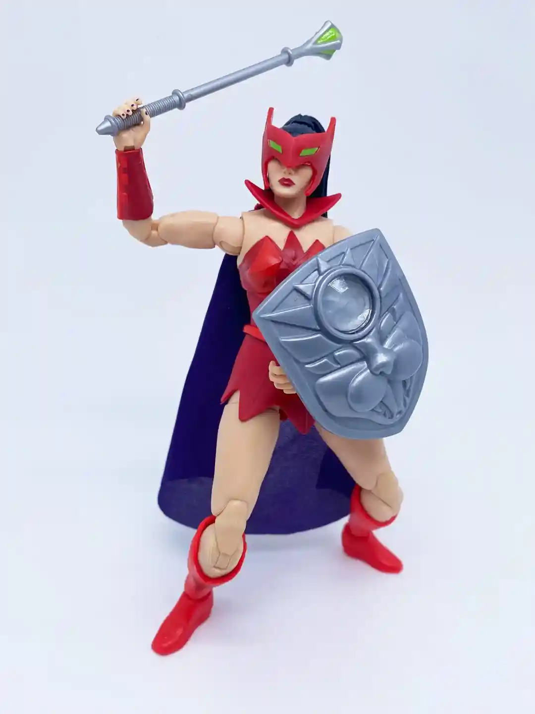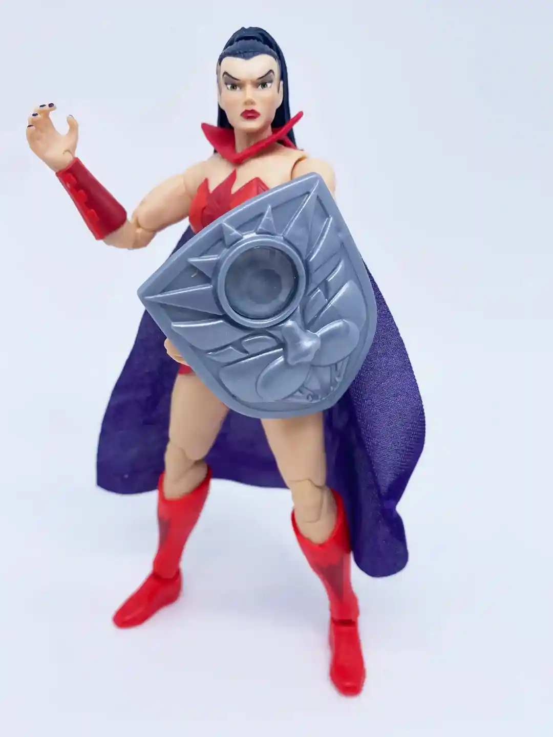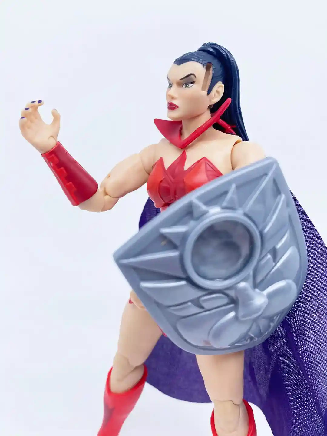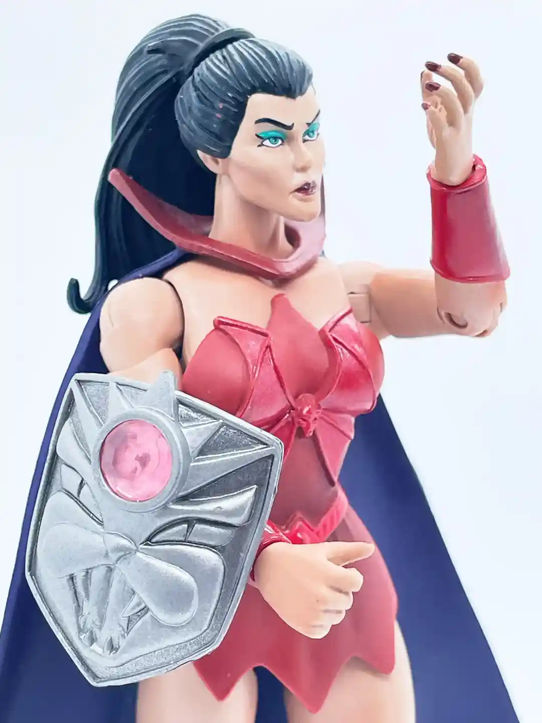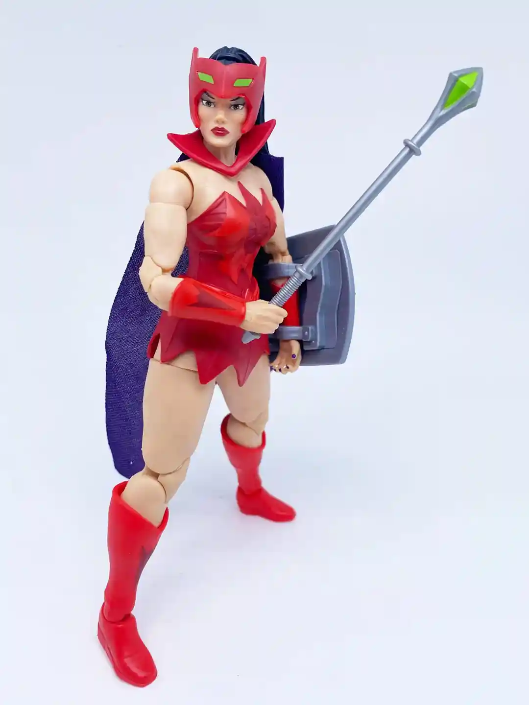 Catra comes with a removable soft good cape, a removable mask, a silver shield with a cat face on it (how apropos…MEOW!), an extra set of hands and silver scepter with a green jewel.