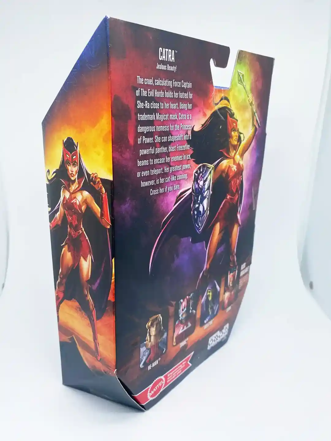Catra looks absolutely beautiful in her feline inspired outfit! On the side art of the package, Catra with her “claws” ready to strike!The back features Catra wielding her Cat faced shield and holding her green jeweled staff up in the air with the beautiful purple red sunset Eternia sky in the background.