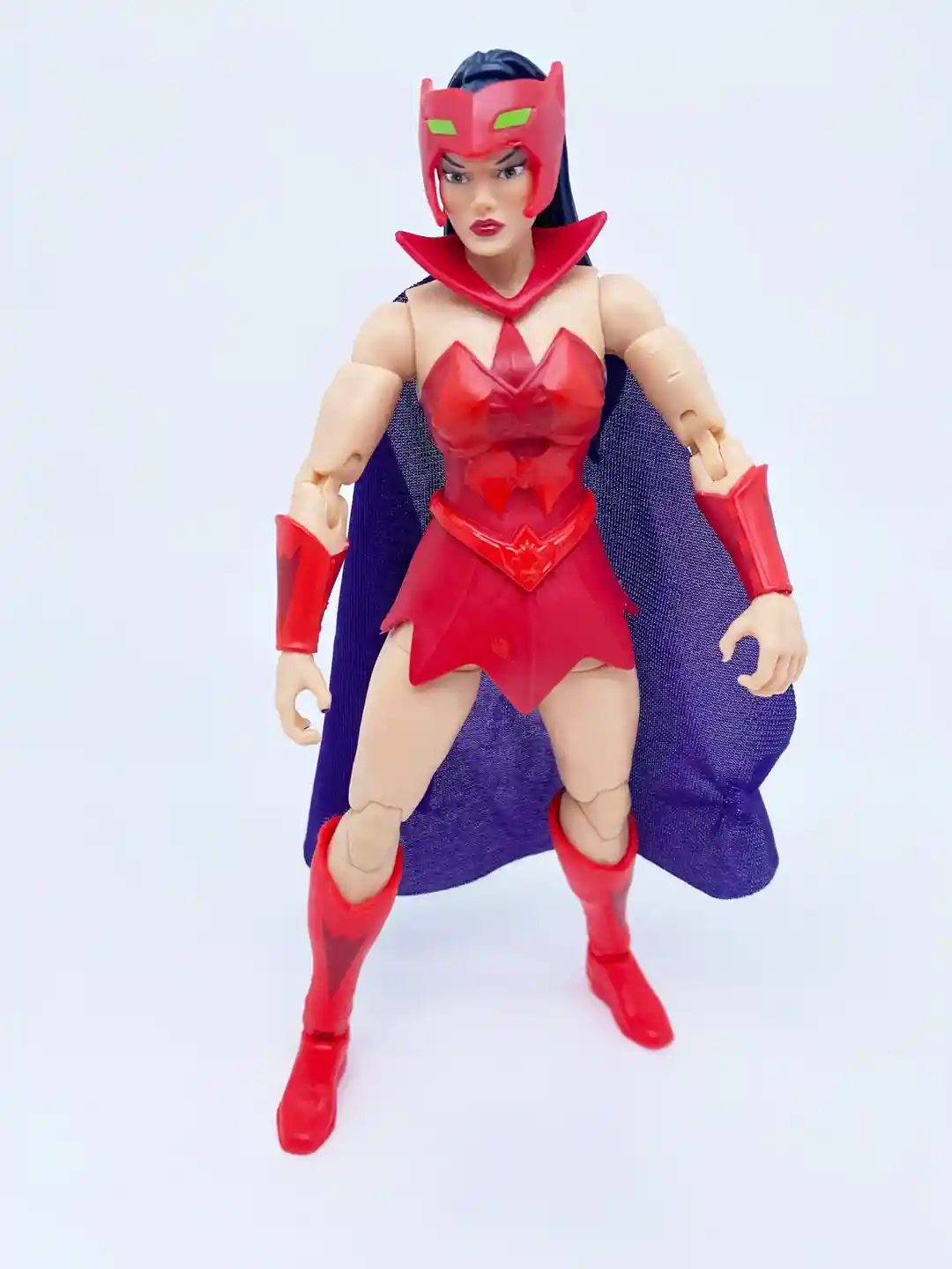 The MOTU Classics and the Masterverse versions are actually very similar to each other, which is great if you missed out on the Classics line! They both feature Catra in the same dress and cape and the only real difference lies in the soft goods and the weapons and accessories pack outs. Although, there is one huge nit that you will see in the photo without her mask (see below)!