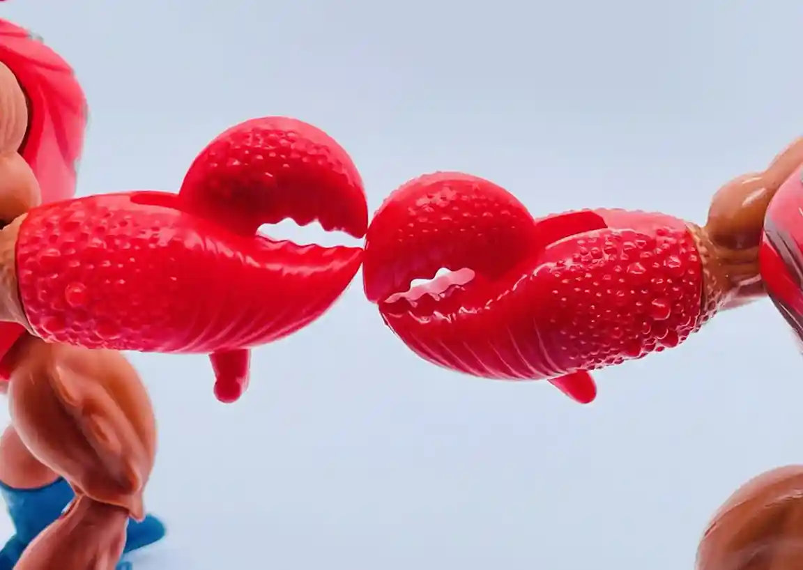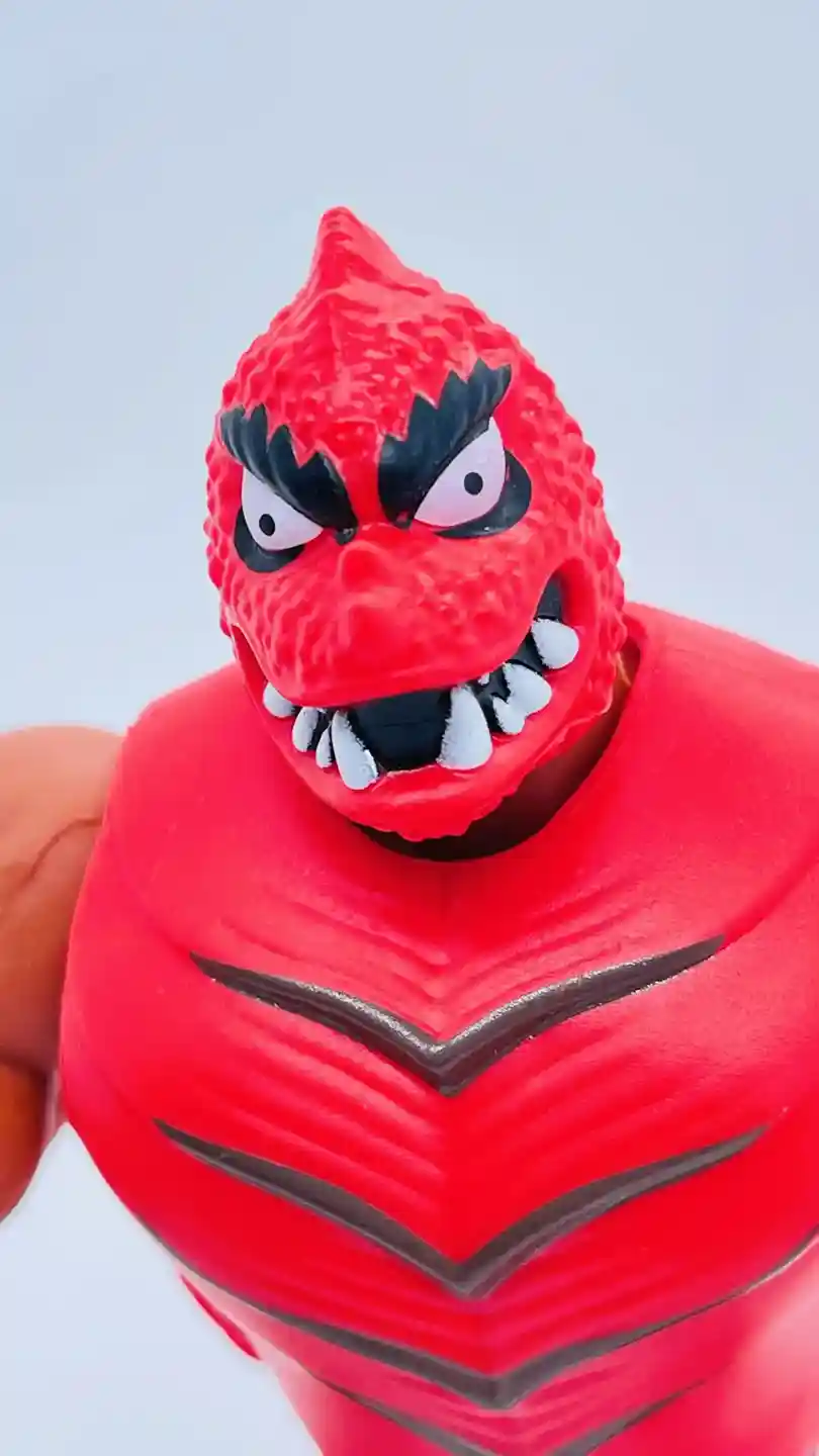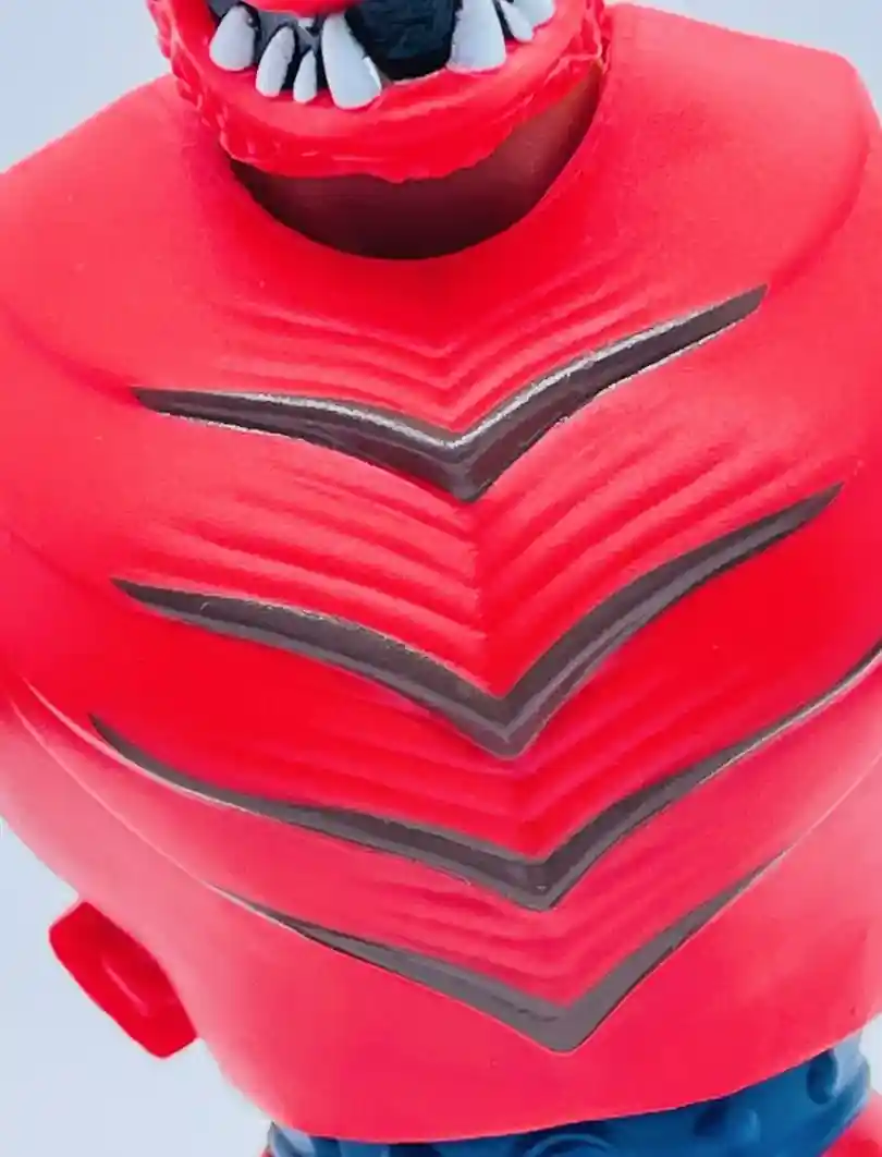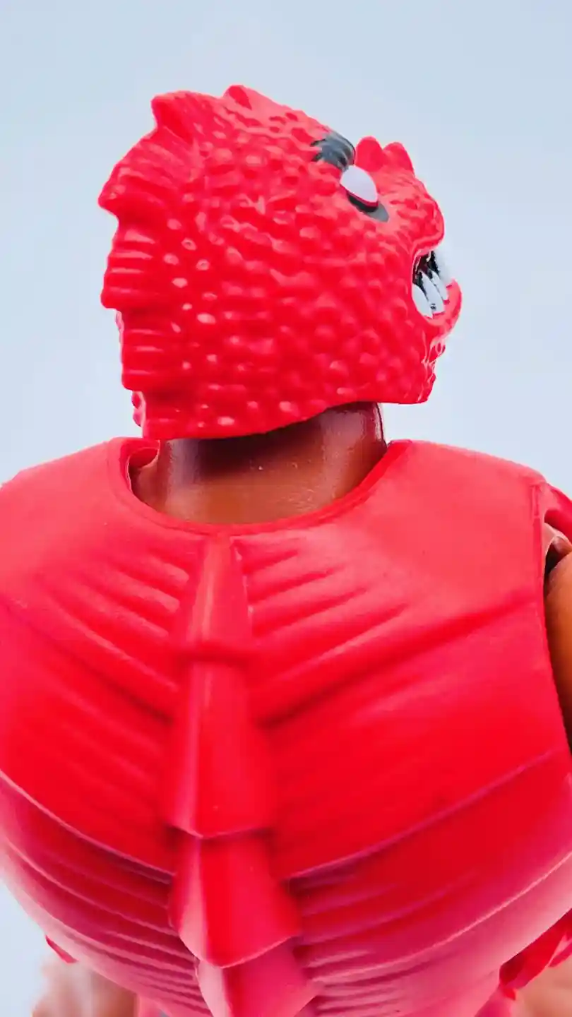 Clawful’s head sculpt features a crustaceous, bumpy texture with the most ridiculous looking thick, bushy eyebrows. I mean, who would of thought of putting Eugene Levy style eyebrows with black eyeliner is beyond me but it totally works! He also has a nostril’less nose and a big’ole mouthful of teeth. The shape of the head is curved like a lobster tail with several crests running down the top of the head all the way to the base of his skull.