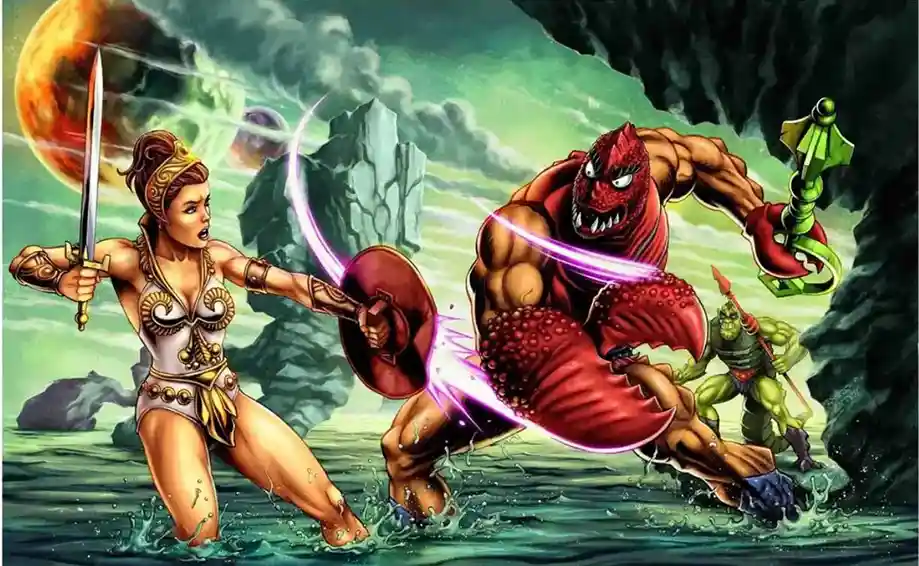 Harkening back to the 80’s version of the card back art, the Masters of the Universe Origins version has a similar feel showcasing Teela and Clawful in a watery duel! The visual portrayal of action in this card art so well done where you can see Clawful’s swinging motion against Teela’s shield.