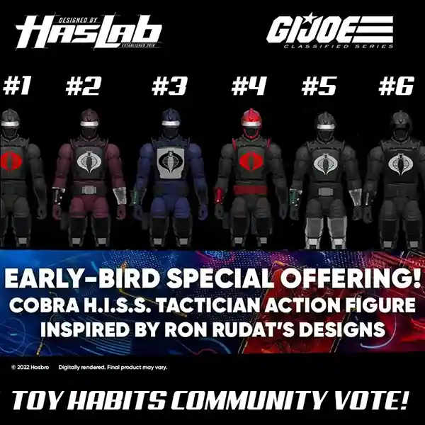 With the early bird goal funded for the HasLab GI Joe Classified Series Cobra HISS Tank, Hasbro is giving us 6 options for the HISS Tank Tactician figure. Which one is your favorite? We would love to know! Review the options below and CAST YOUR VOTE for your favorite version of the HISS Tank Tactician in the poll below!