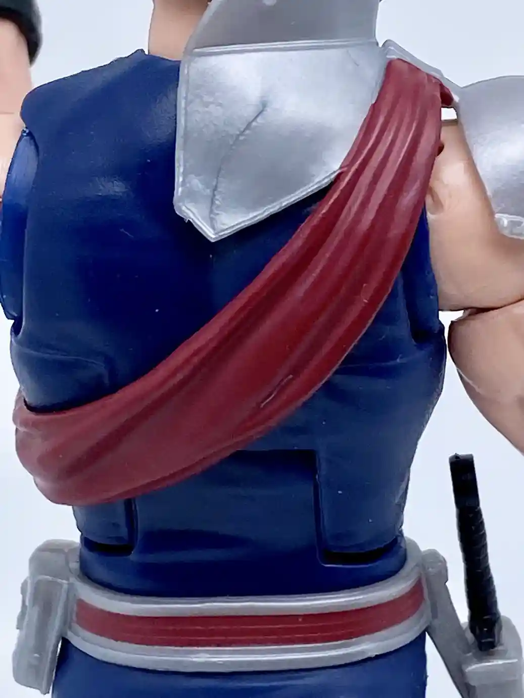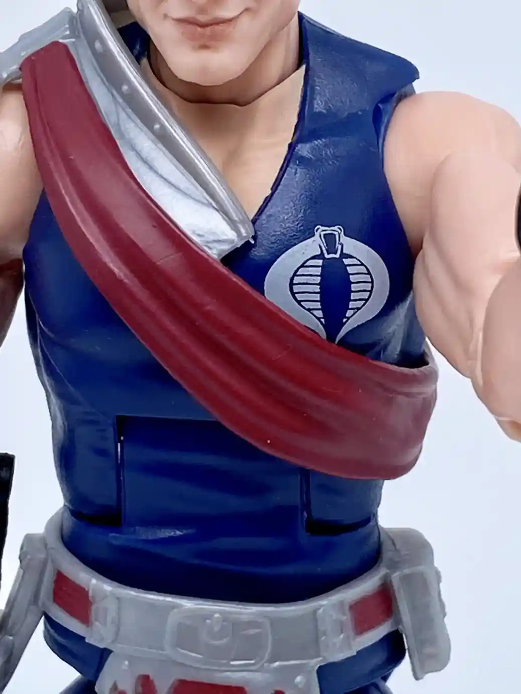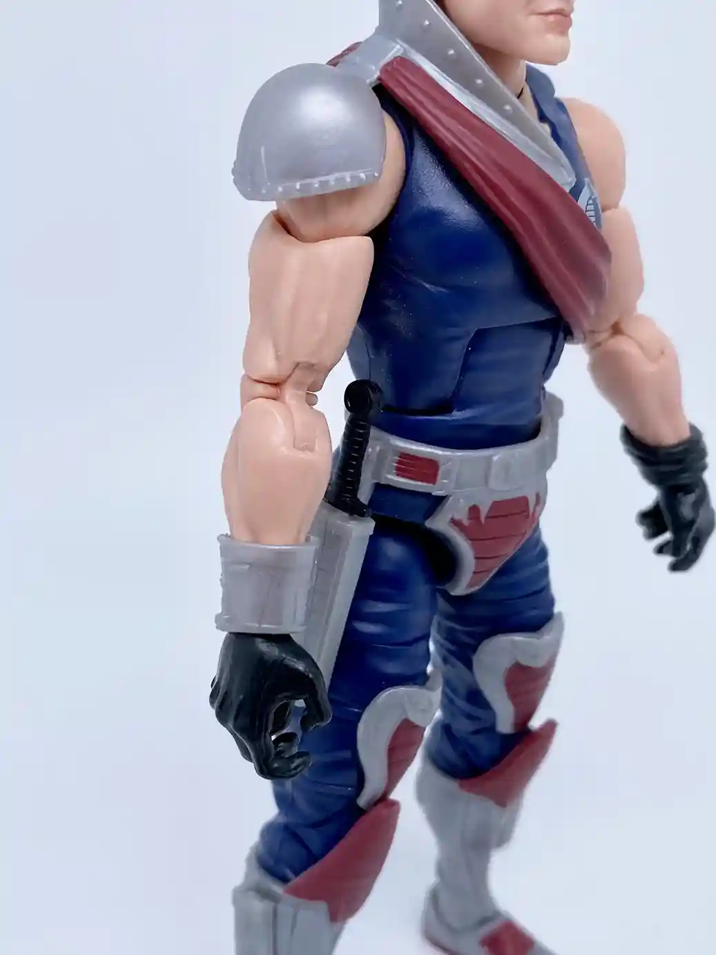 Tomax is dressed in his classic blue outfit with silver and crimson accents. He is wearing his classic silver shoulder pauldron and crimson sash, which wraps down from his right shoulder around his waist. This is a separate piece which sits on his torso and Im sure could be removeable. His shoulder pauldron is of a nice silver plastic color and has rivets molded along the top edge to give it that extra detail. Tomax wear a silver Cobra logo on his left chest same as his vintage counterpart. his back is a simple blue design and his shoulder pauldron is pegged into the peg hole in his back. Tomax’s chest design is the perfect proportion for this figure and Hasbro nailed it! This figure is nostalgia all the way!
