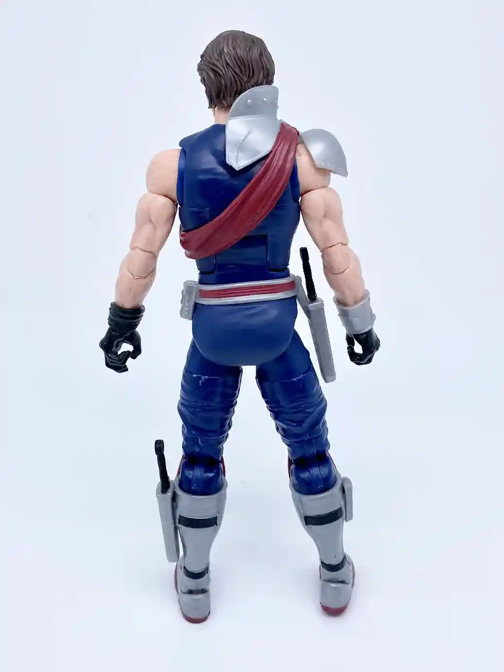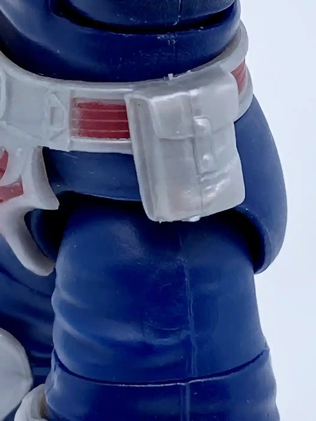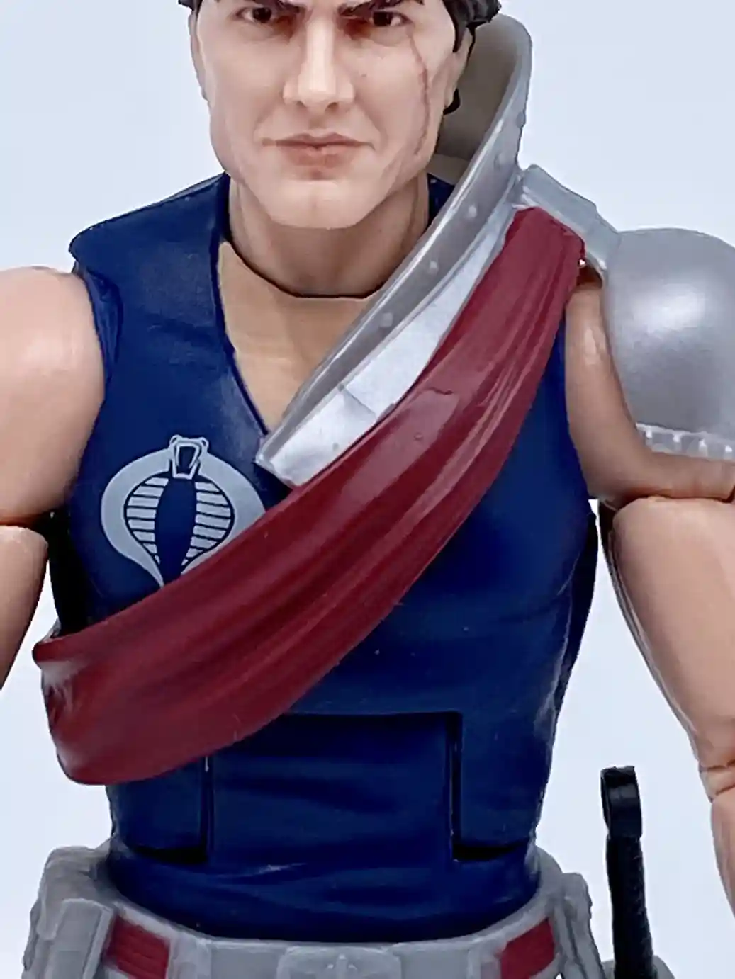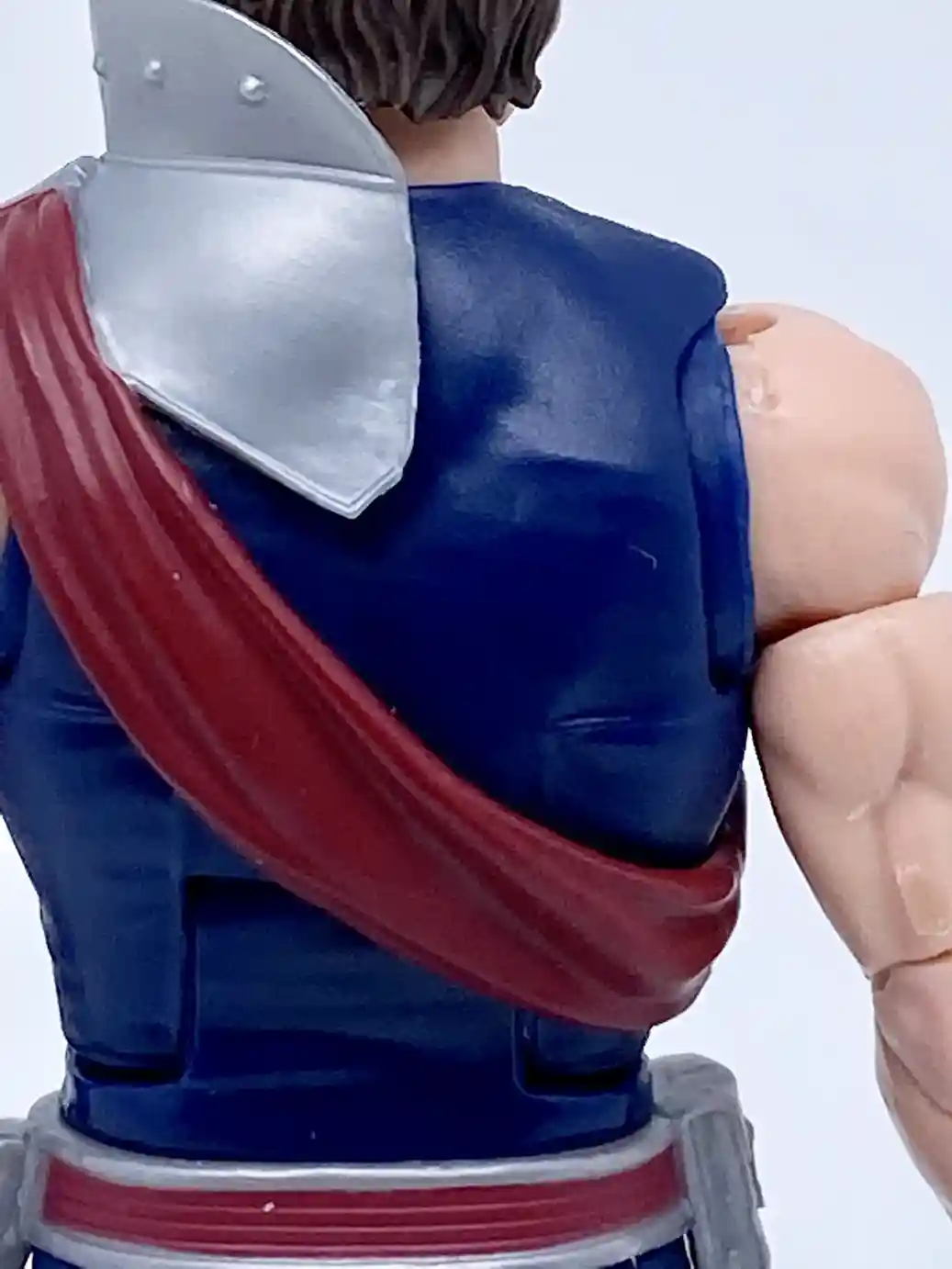 Tomax is dressed in his classic blue outfit with silver and crimson accents. He is wearing his classic silver shoulder pauldron and crimson sash, which wraps down from his right shoulder around his waist. This is a separate piece which sits on his torso and Im sure could be removeable. His shoulder pauldron is of a nice silver plastic color and has rivets molded along the top edge to give it that extra detail. Tomax wear a silver Cobra logo on his left chest same as his vintage counterpart. his back is a simple blue design and his shoulder pauldron is pegged into the peg hole in his back. Tomax’s chest design is the perfect proportion for this figure and Hasbro nailed it! This figure is nostalgia all the way!
