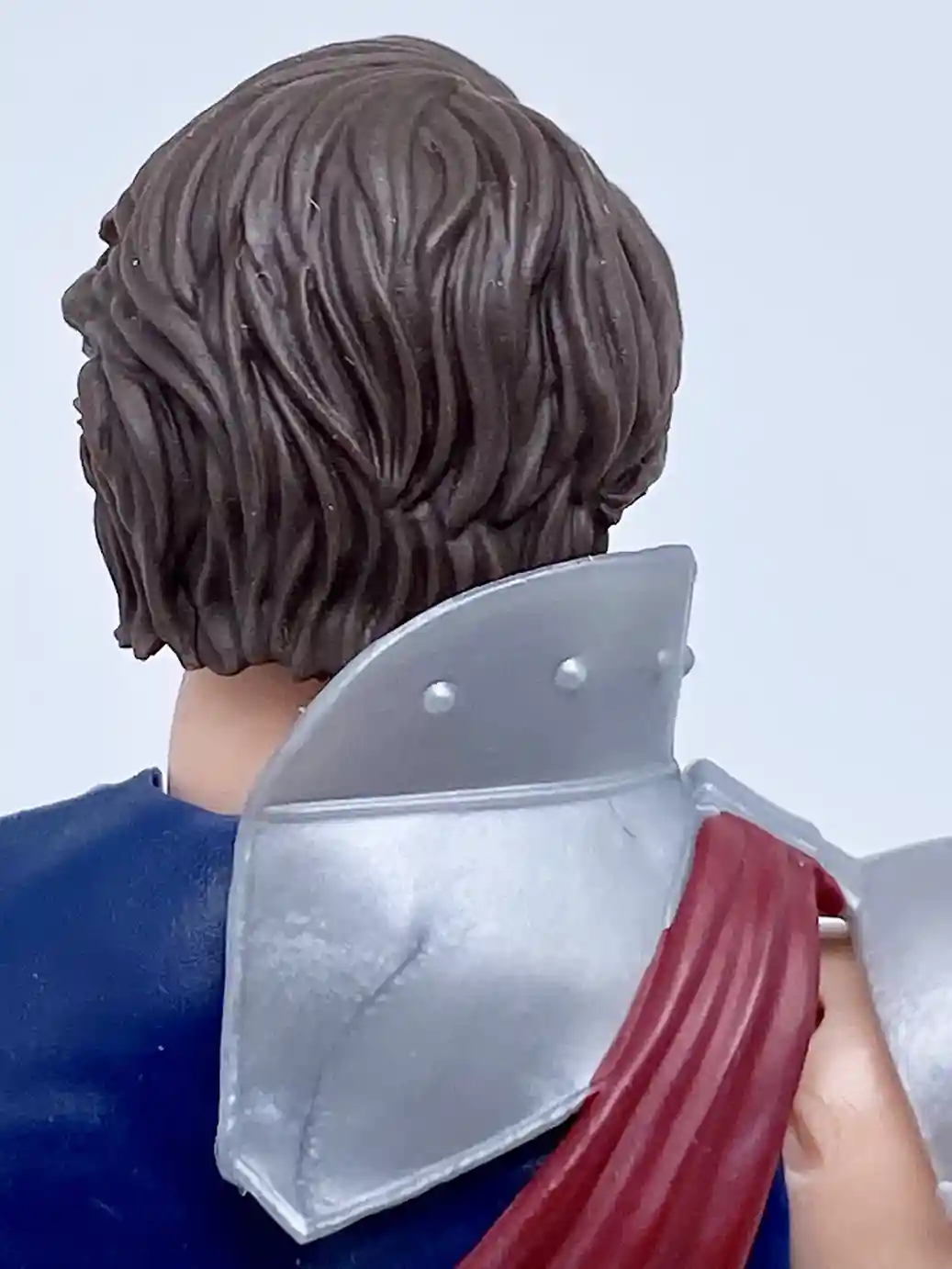 Tomax’s arms sculpt are very simple but his is perfectly ripped for his stature, with looks of muscle tone and details showing in his biceps and lower arms. He has sleeveless arms and is wearing a silver wrist bracer on his right wrist since this is the battle side along with his shoulder armor. (Xamot’s is on the left). His left hand features a black glove that goes up past his wrist and no wrist bracer here. (Xamot’s is on the right).