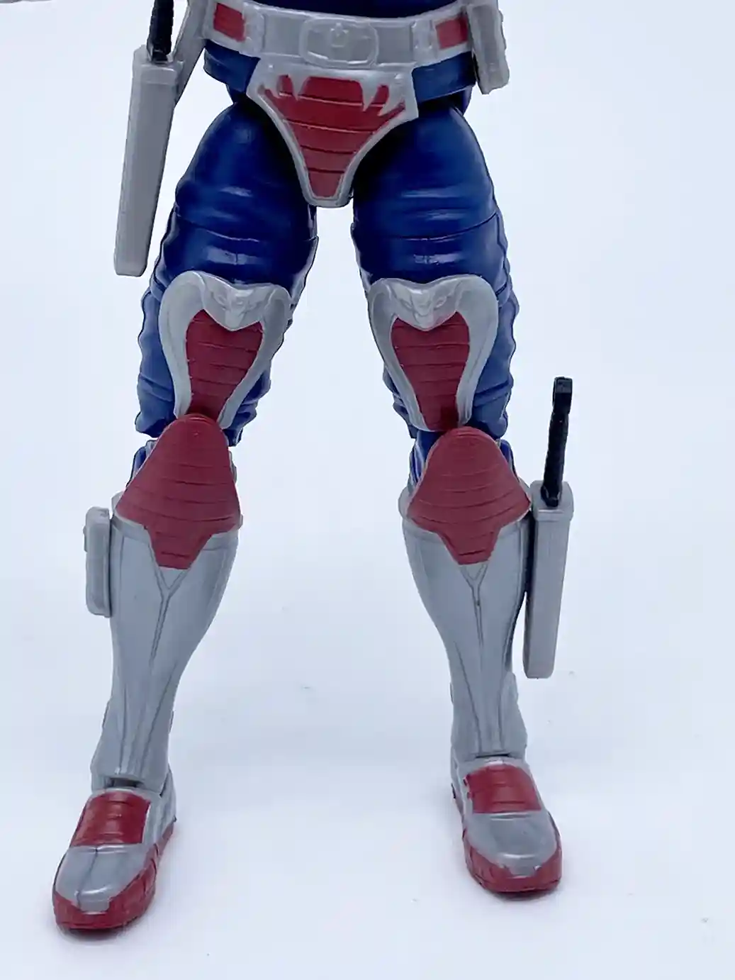 Just like the vintage action figures, both Tomax and Xamot are wearing blue pants and are wearing shin guards. These are the same on both twins, so this is a place Hasbro had it easy to use exactly the same shared parts. They are molded straight from the vintage design to look like silver cobra heads with stripped crimson accents. They come from his knees down to the top of his boots.