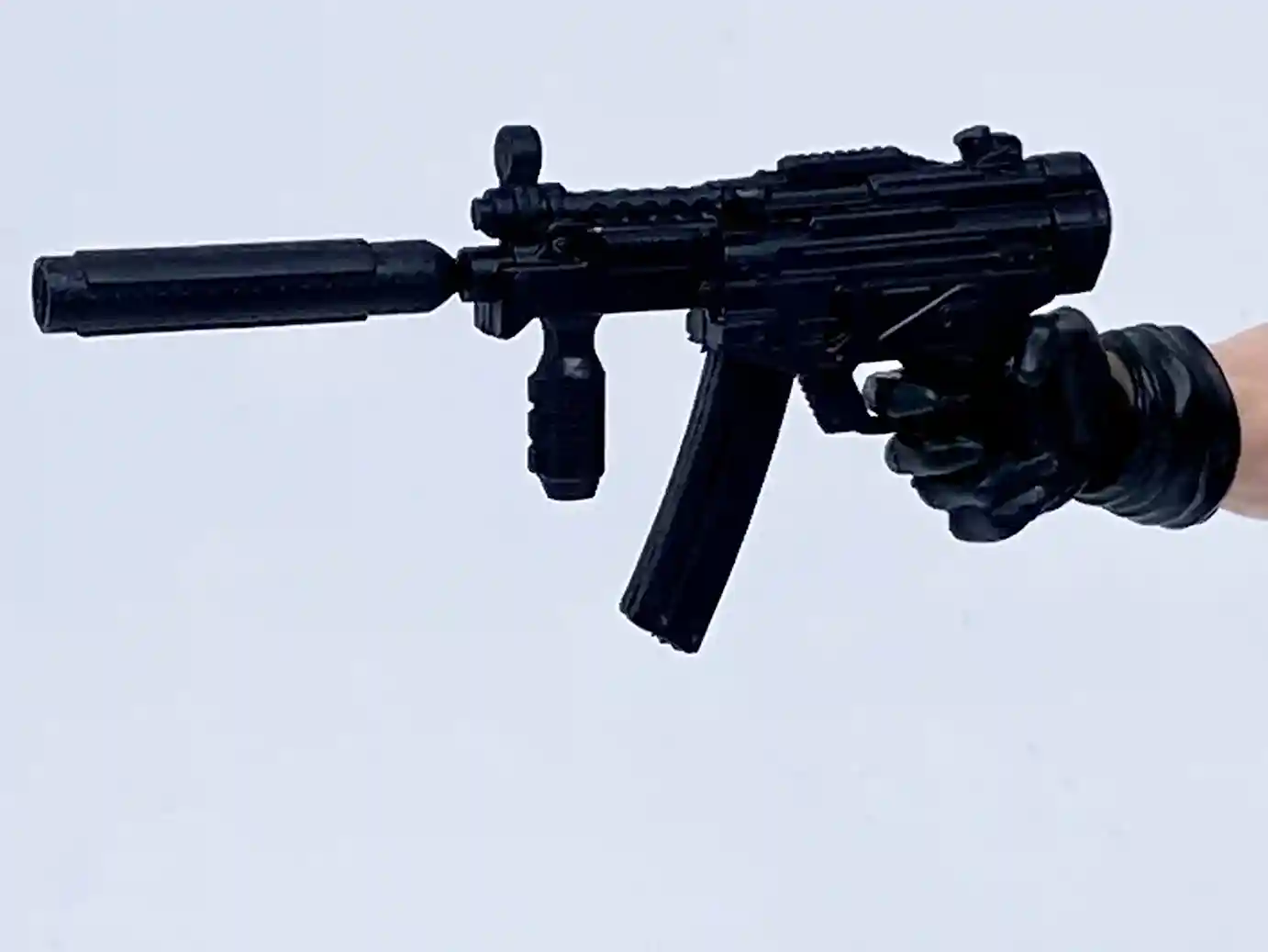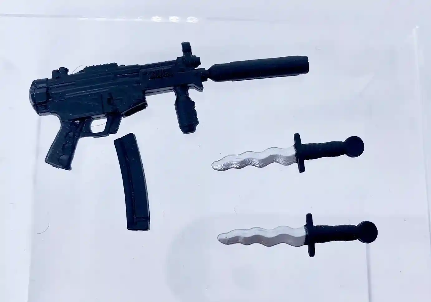 The dagger knives are very well done with a nice silver paint application on their blades. The vintage inspired MP5K sub machine gun is perfectly executed and includes a removeable magaizine clip and silencer, which has a hole in it to attach blast effects.