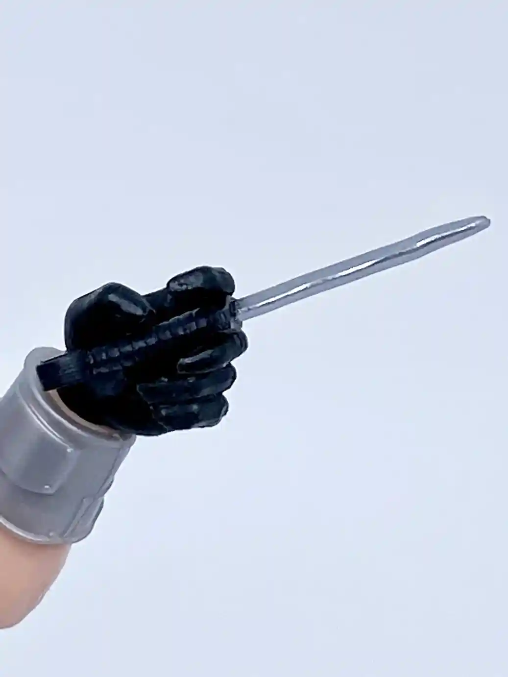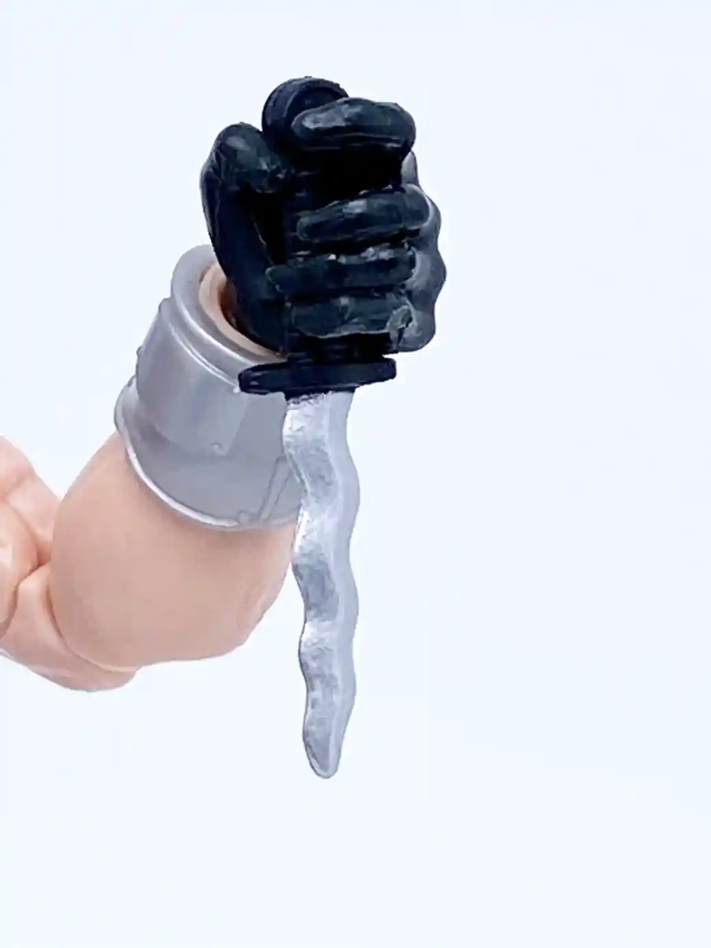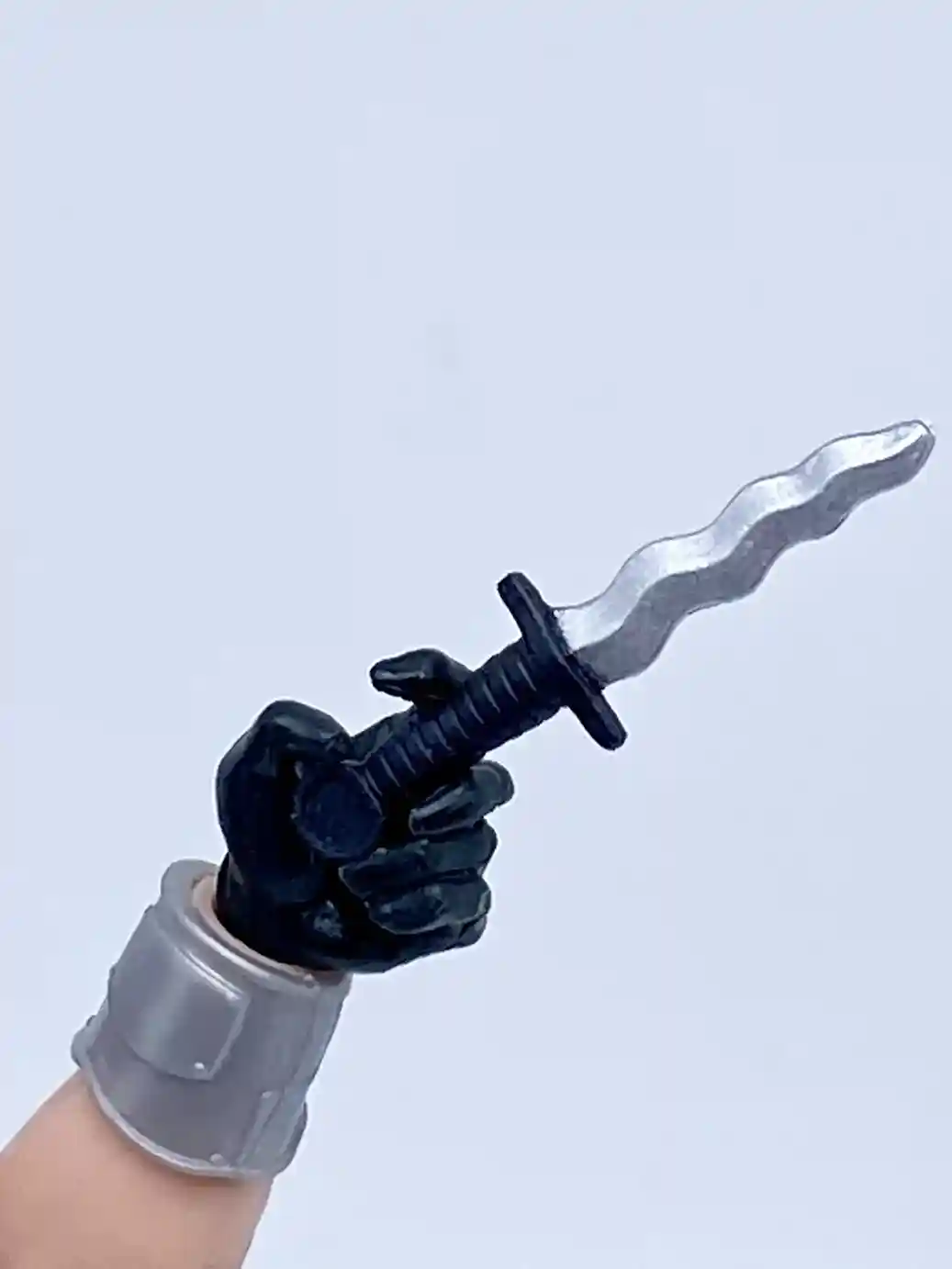 You can holded the Sub-Machine gun with one hand, or he can grip the extra grip and hold it two handed. The dagger is very nice and the Twinsies have various gripping options with those. They can hold it thru their fingers, grasp the handle forward, or hold it gansta style with the blade downward!