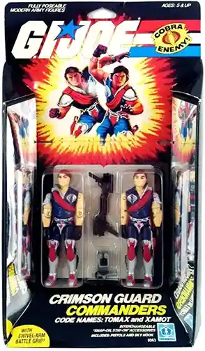 Tomax and Xamot Paoli (also called the Crimson Twins or Crimson Guard Commanders) are fictional characters from the G.I. Joe: A Real American Hero toyline, comic books and animated series. They are the co-leaders of Cobra‘s elite troops, the Crimson Guard, and debuted in 1985. Their preliminary names were Movat and Tovam. The Paoli brothers speak in notable accents which show they are from Corsica.