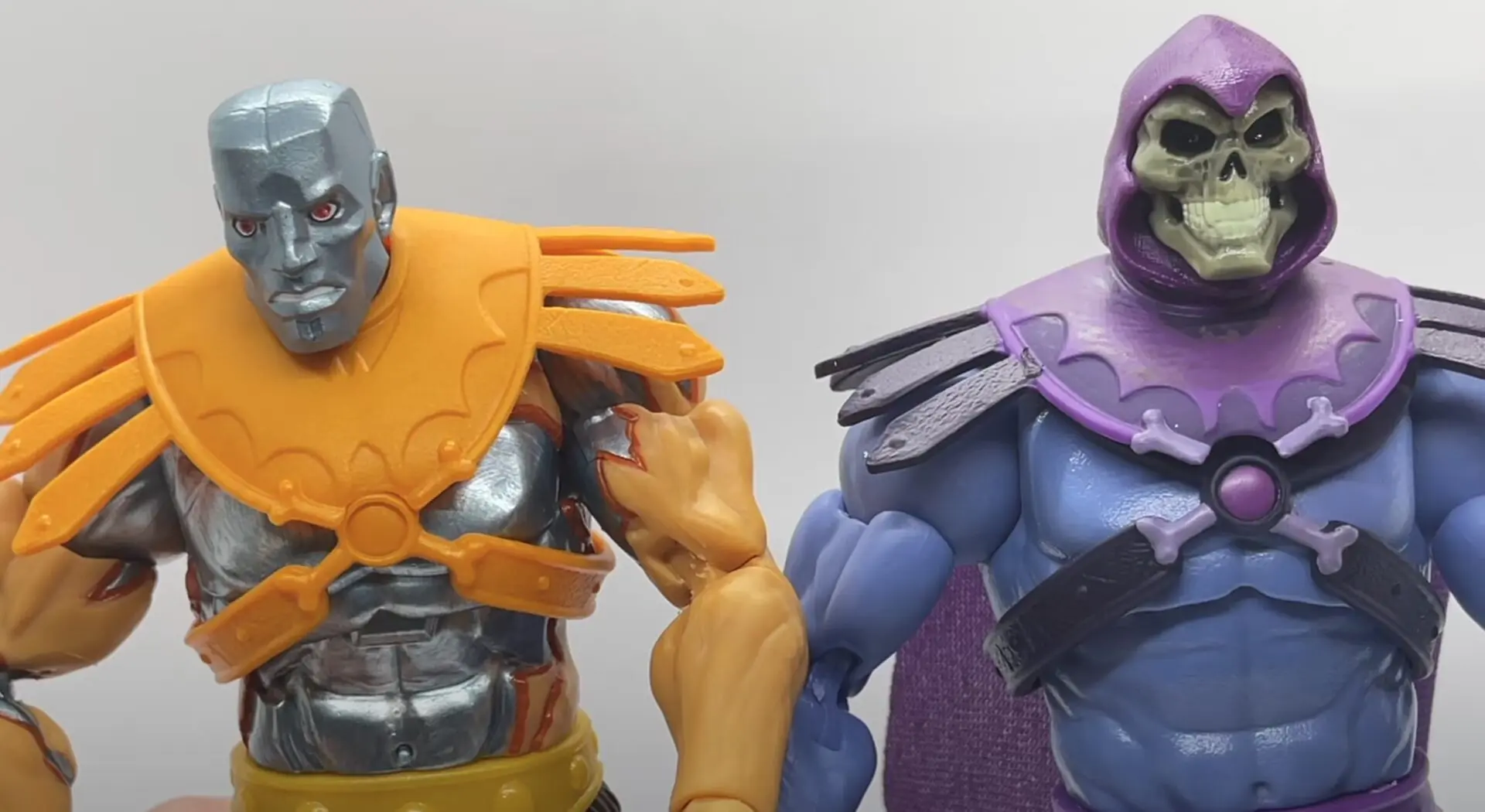 Faker Comes with orange armor on which coincidentally is exactly Skeletor’s armor and it’s really easy to put on there are a couple clips that attach to this little peg here and they just kind of plug in and you can actually fix them to the back and get them to secure so this piece is not super hard to put on and you can see some of the texturing detail they have on the shoulder pieces as well as the back straps and here is Skeletor just for comparison here and what we can see is that this faker armor is the exact replica of Skeletor armor just with one single difference Skeletor armor is two pieces where fakers is one piece.