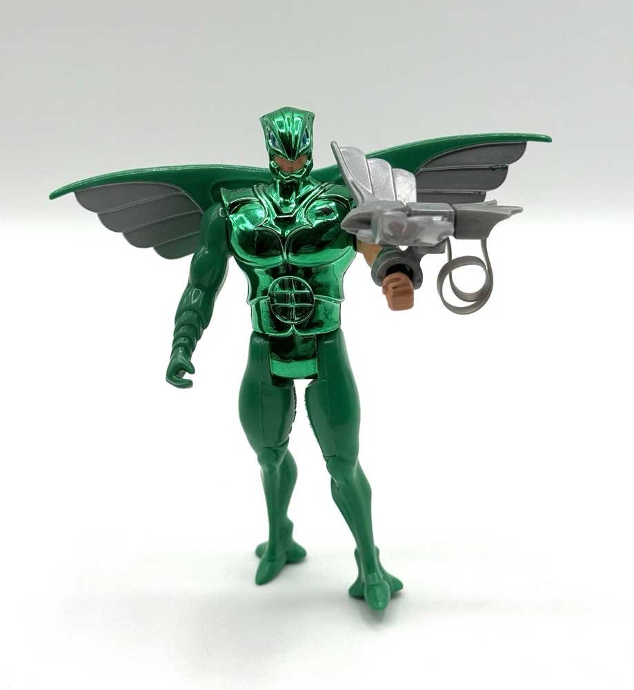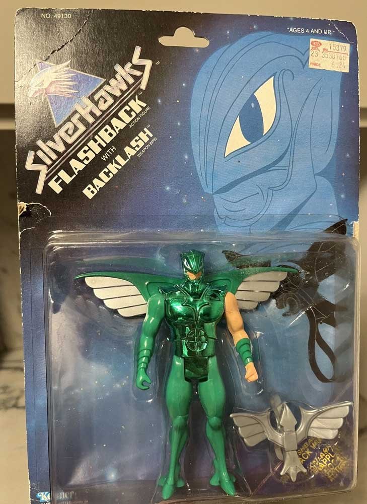 Here we get a look at the vintage Flashback figure from the SilverHawks line, complete with his companion bird Backlash. Flashback is decked out in a shiny metallic green suit with wing extensions and silver accents, while his left arm is left bare to show skin tone. The figure comes with Backlash, a silver bird accessory that attaches to his arm. On card, you can see the classic Kenner packaging with Flashback secured in the bubble alongside his bird, and loose he shows off his articulated limbs and the reflective finish of his suit.