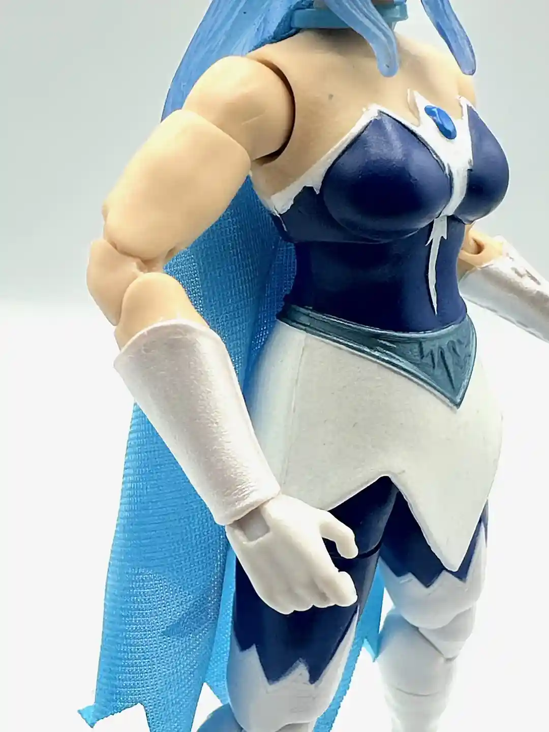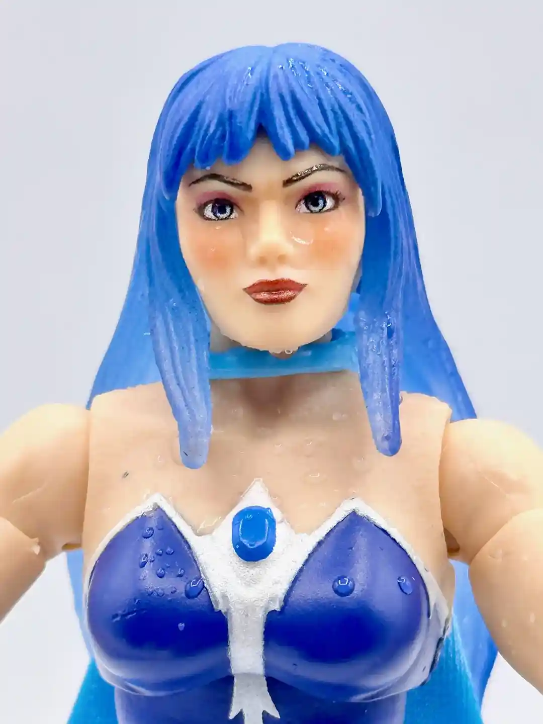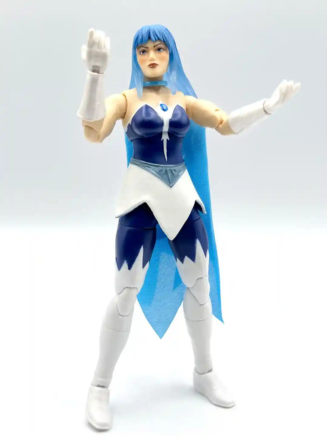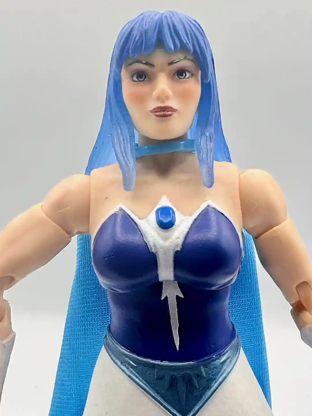 Modeled after her Filmation look, Frosta has a blue and white dress with a blue jewel in the middle. The white accents continues around the back of the figure and we removed her head so you can see what is under the hair in the back.