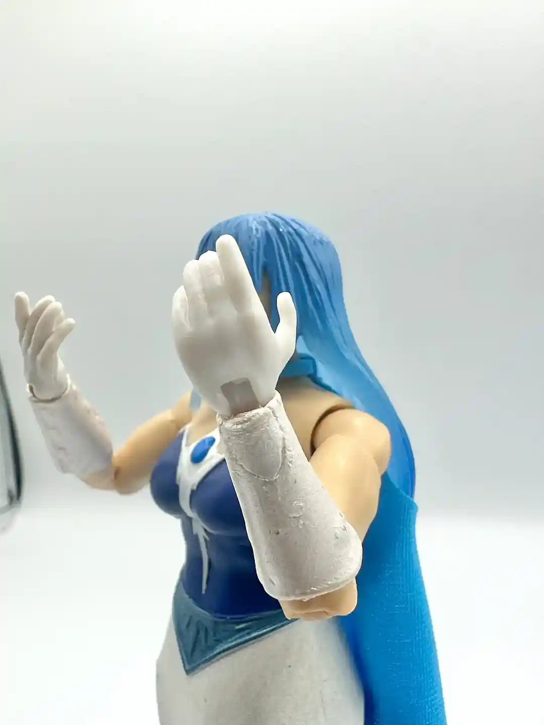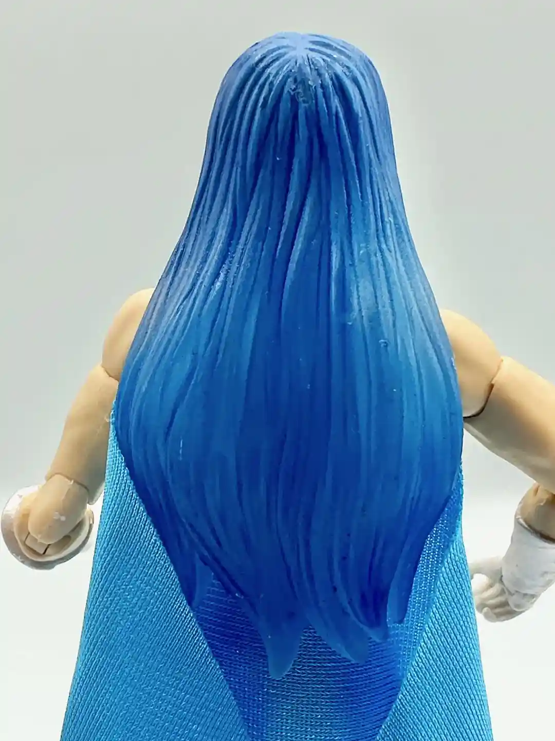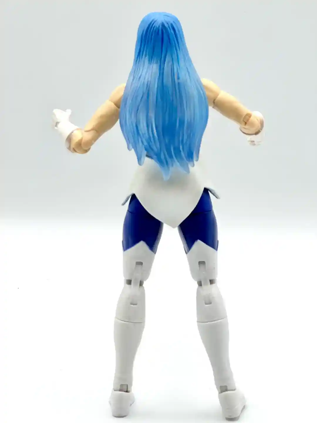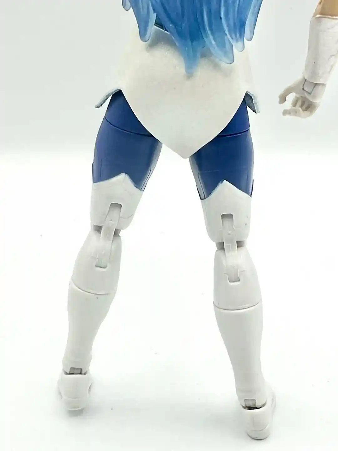 Modeled after her Filmation look, Frosta has a blue and white dress with a blue jewel in the middle. The white accents continues around the back of the figure and we removed her head so you can see what is under the hair in the back.