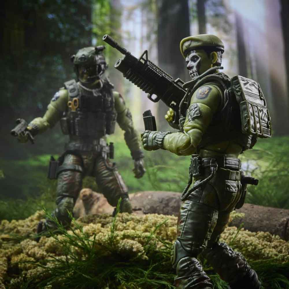 Two figures move forward through a forest setting, both outfitted in green tactical uniforms with armored vests and camo pants. The front figure carries a compact rifle with molded detailing along the barrel and stock, while the second figure behind him wears the skull face covering and carries a longer rifle.