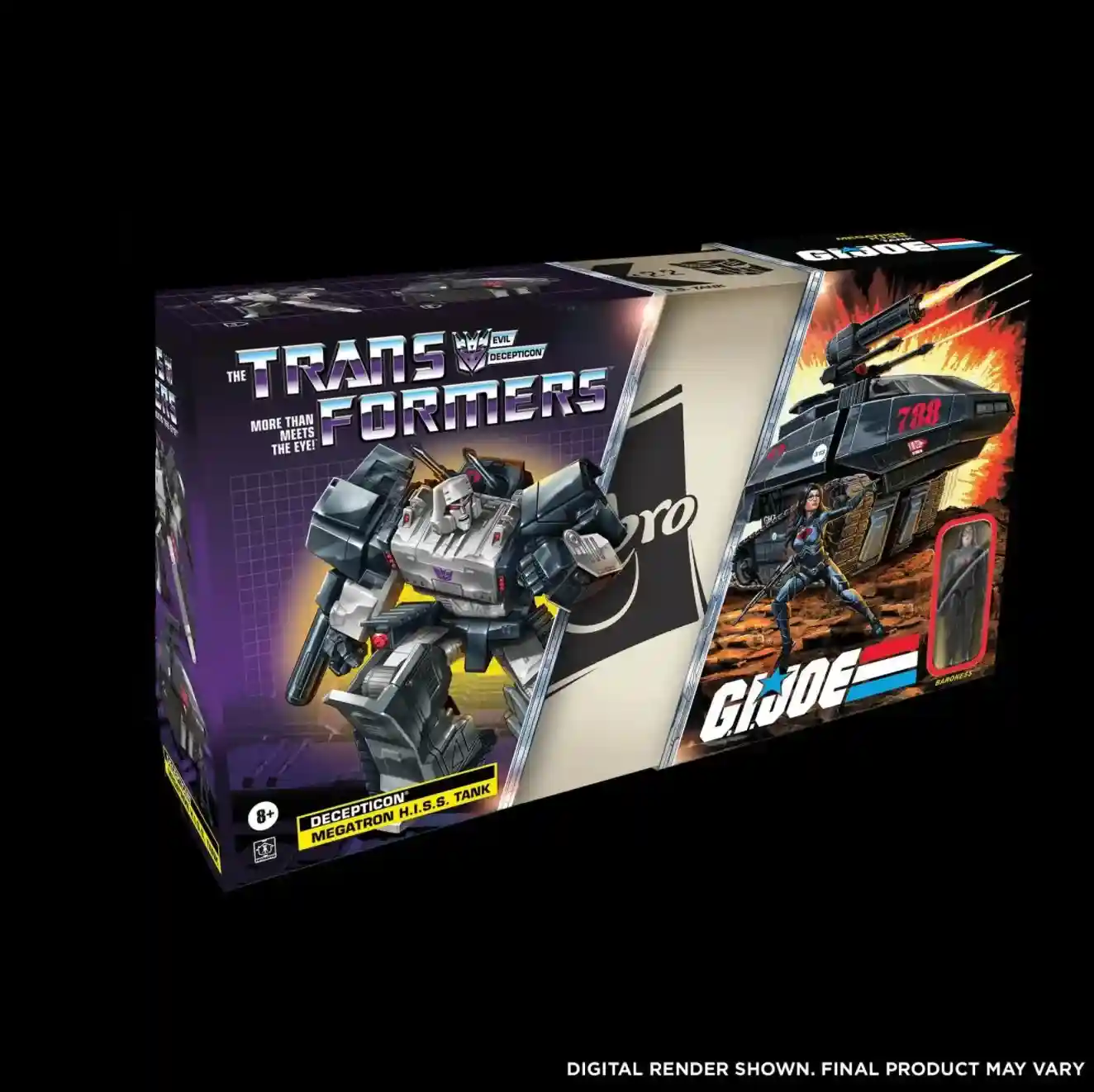 The packaging for the Transformers x G.I. Joe Collaborative Megatron H.I.S.S. Tank with Baroness set features artwork of Megatron in robot mode alongside his H.I.S.S. Tank form. Baroness is illustrated beside the vehicle, and the design merges Transformers branding with the G.I. Joe logo and vintage explosion-style art.