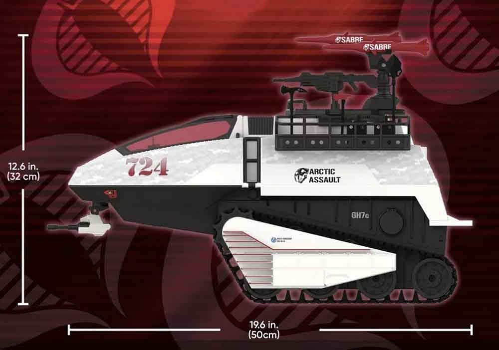 Lean and sleek, the Arctic Assault H.I.S.S. measures 19.6″ (50 cm) long and stands 12.6.” (32 cm) tall. The single cockpit seat affords a narrower silhouette than the Joe’s SnowC.A.T. while still providing ample rear cargo storage and troop transport at a mere 9″ (22.9 cm) wide.