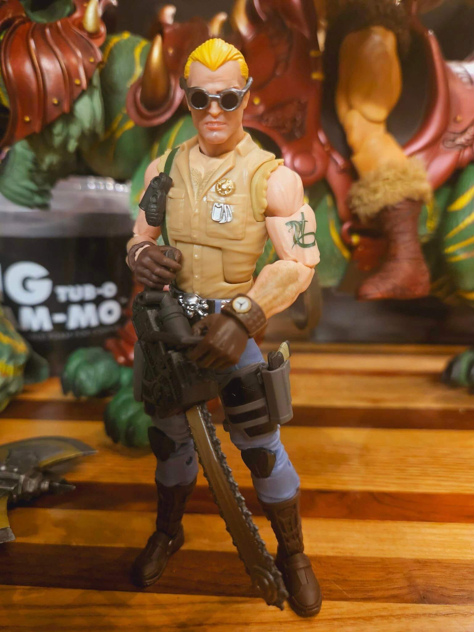 We are getting yet another Dreadnock, Buzzer. His googles are removeable and he comes with a logger style chainsaw. Kelar chainsaw pants, a kids baseball bat with chainsaw blades on them. He is also wearing a removeable watch. He has slick back hair with his signature ponytail, and stubble on his face. He comes with his chain saw of course.