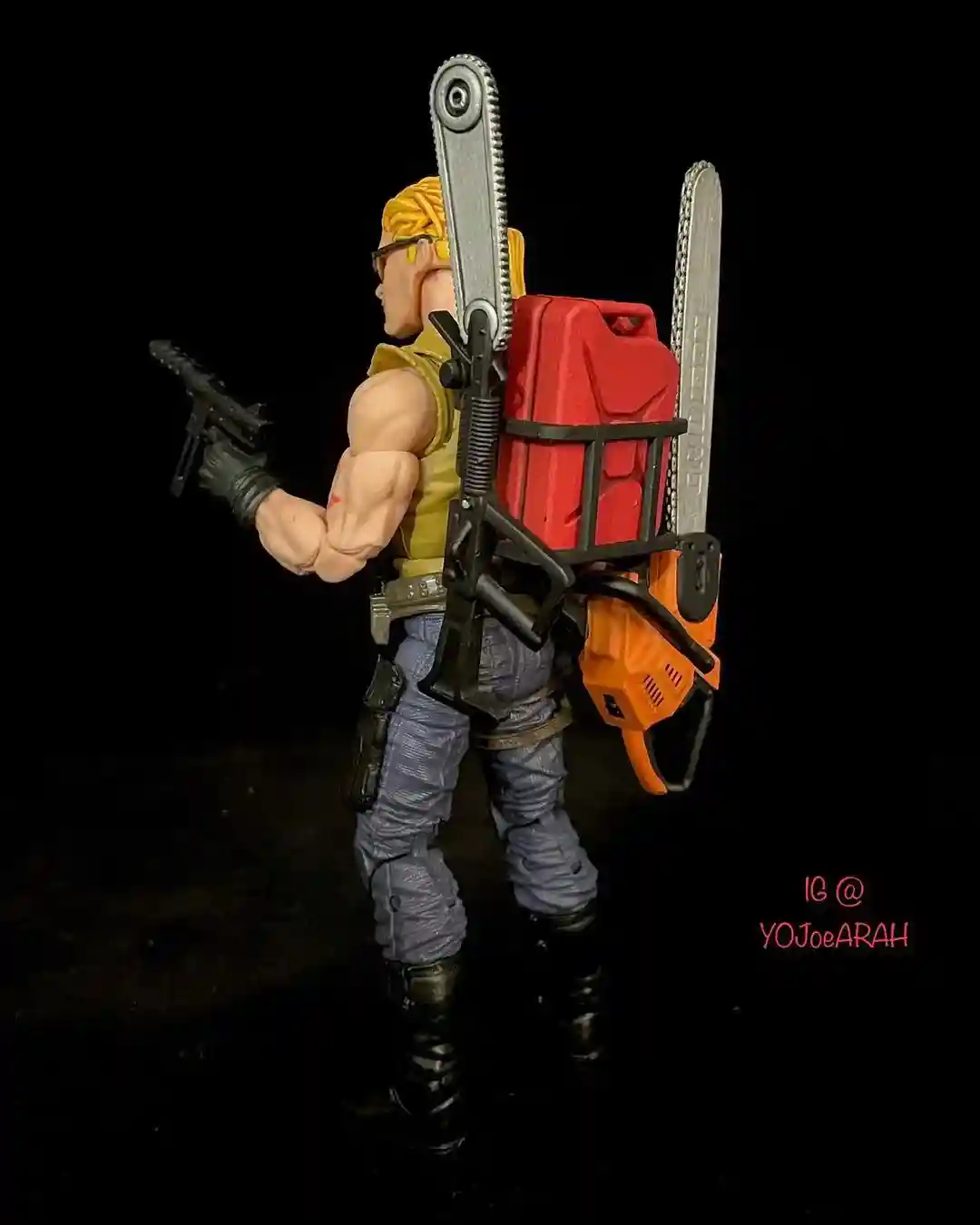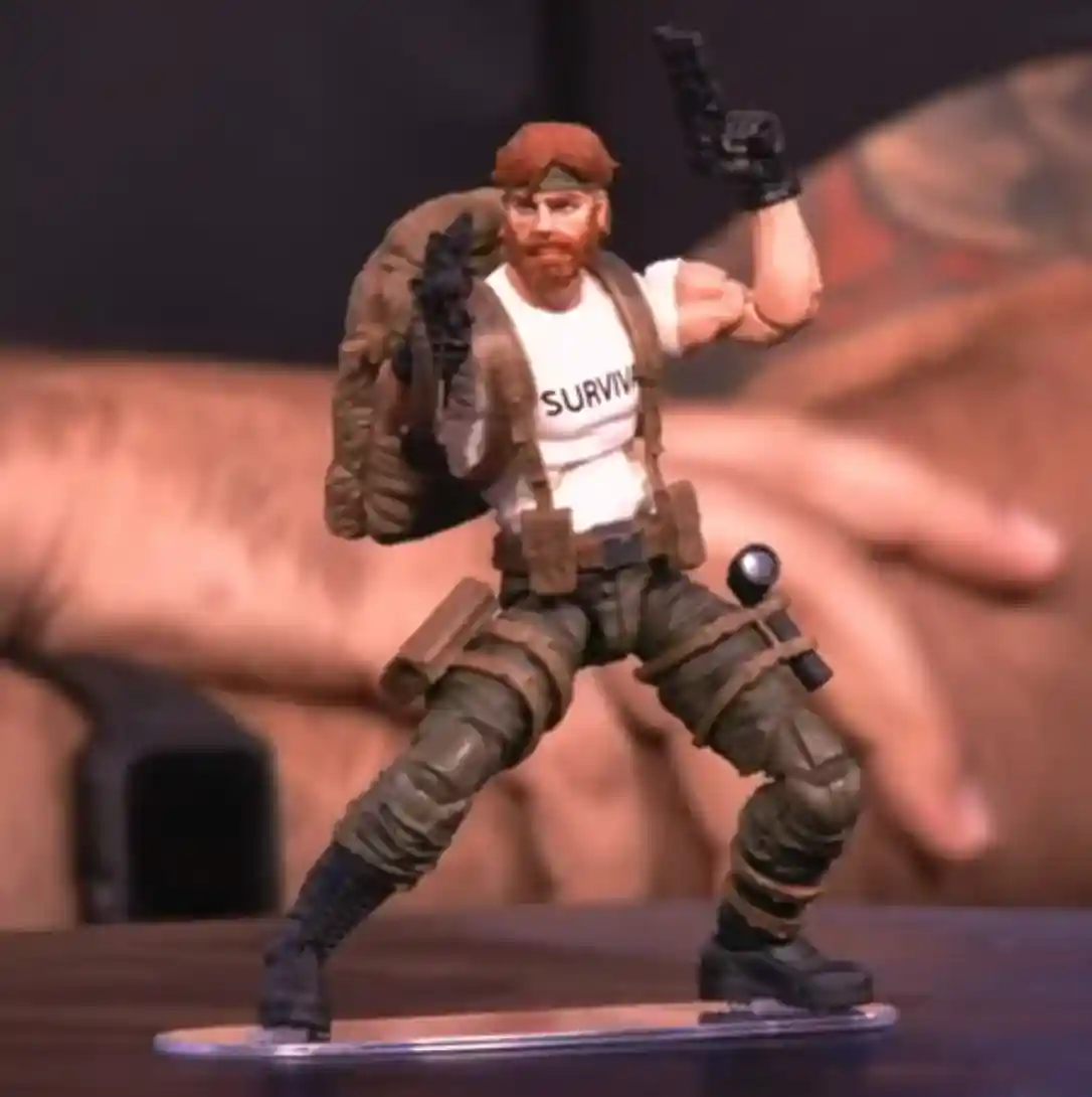 Here we have yet another repaint, but one I can’t be more excited to be getting already!! It’s Outback in his vintage colors with the “Survival” white T Shirt and green camo pants, and red hair. So excited for this one! He even includes red arm hair! He has updated artwork by Hartly Holmes.
