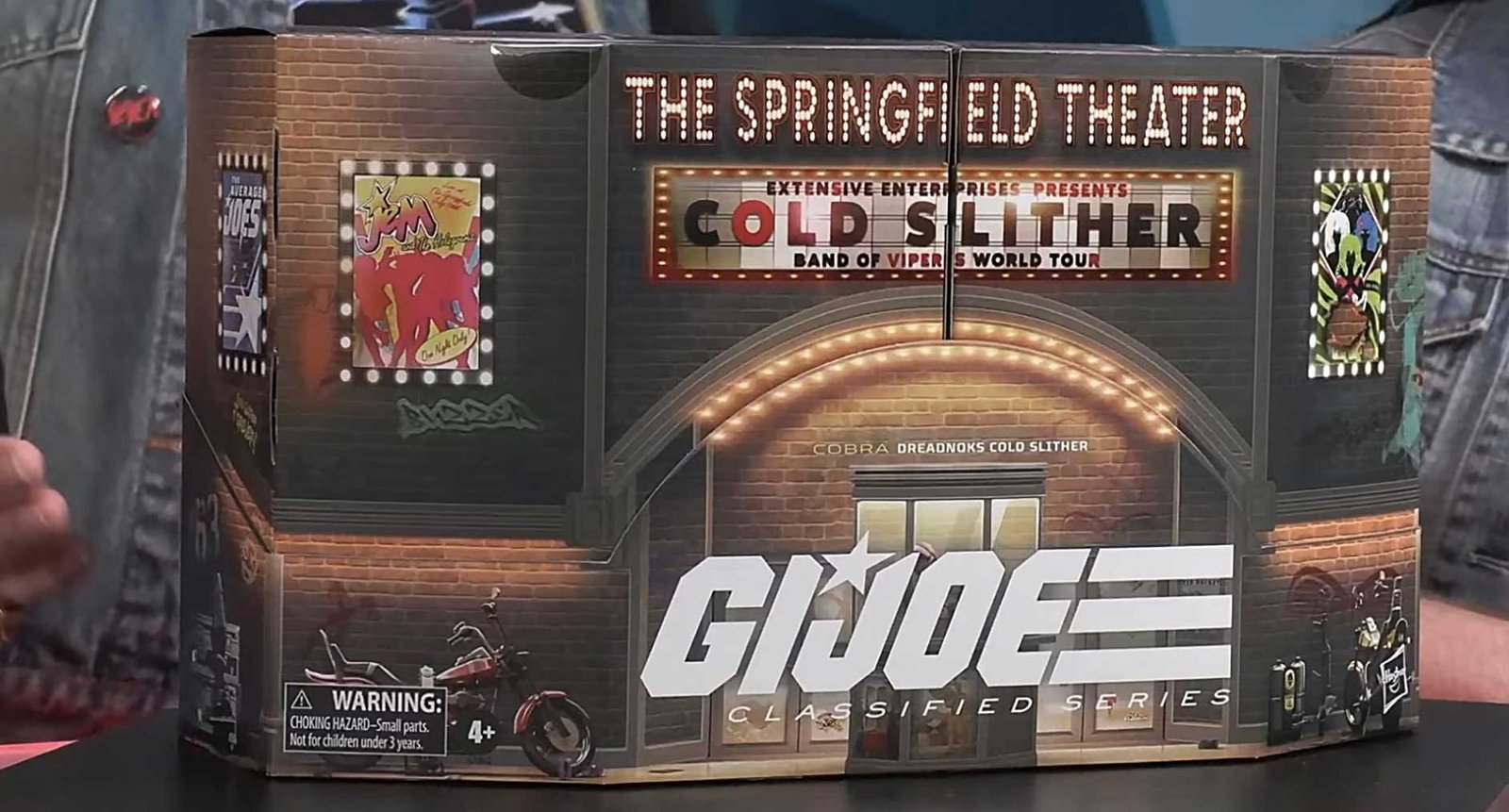 As the Hasbro team is telling the story of Cold Slither with the packaging, they said there are many Dreadnock Easter eggs on the exterior. The figures will be blistered inside the packaging and will be able to display as if they are performing on stage. The box is labeled “The Springfield Theater”.