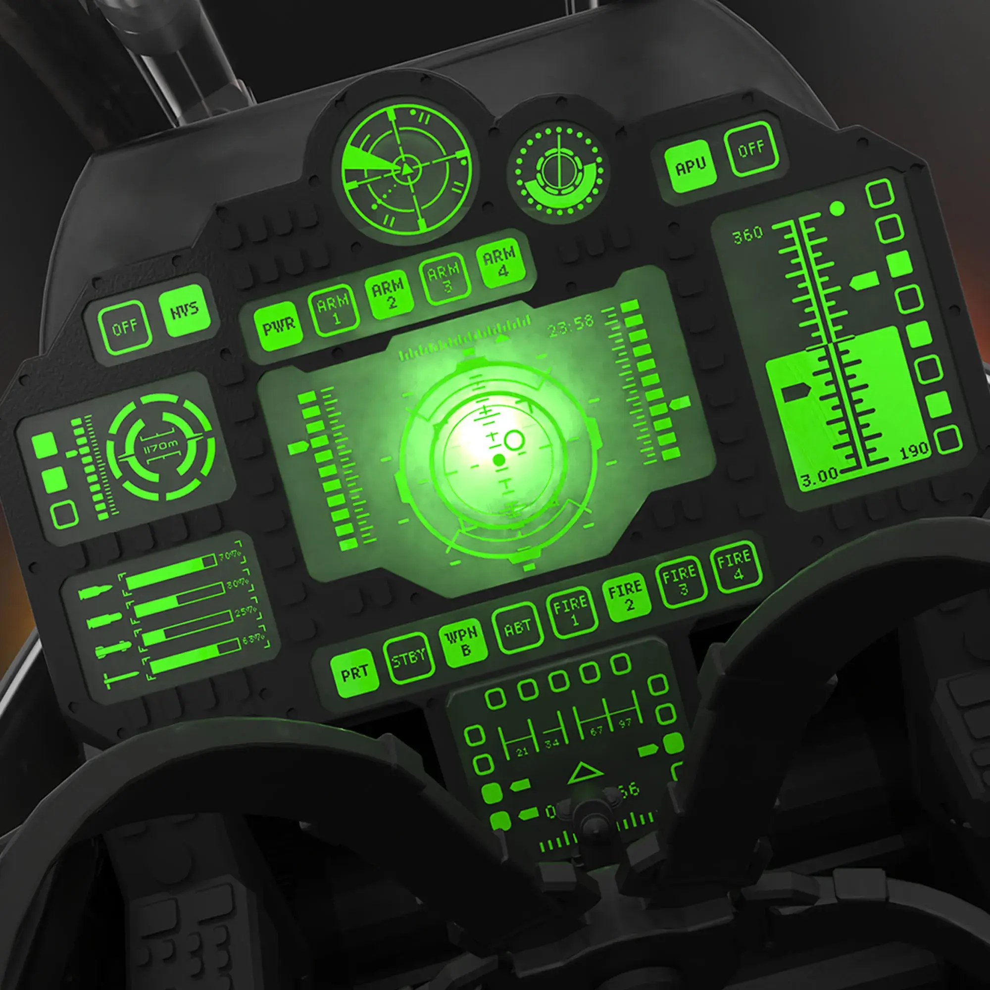 · Elaborately-detailed Command Cockpit Interior: The copter pilot and gunner sit buckled with a 4-point harness in front of specialized illuminated instrument control panels. You can pose each figure operating the center, floor-mounted control stick and throttle controls maneuvering around and locking in on an oncoming H.I.S.S.