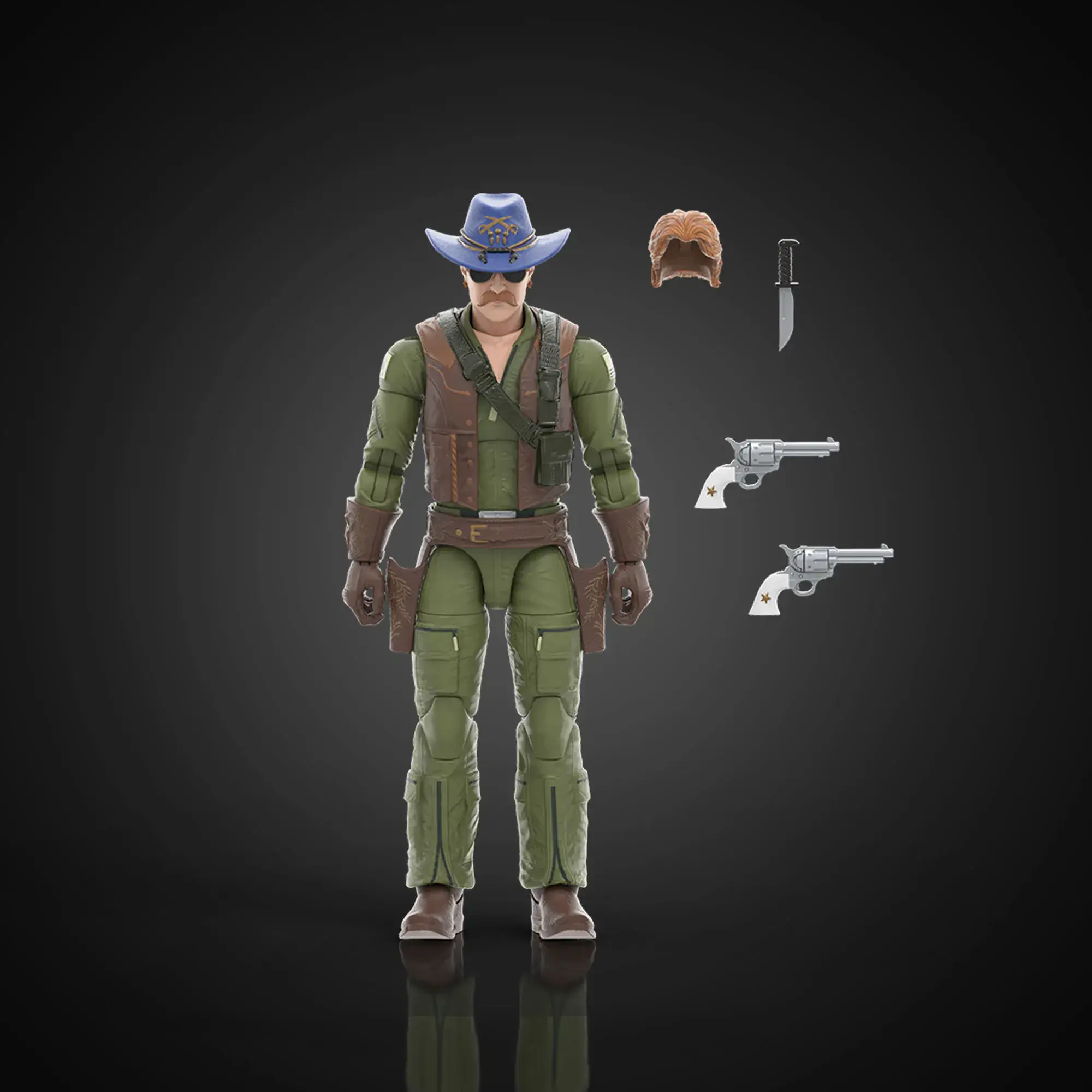 Will Bill comes with a removable hat and removable hair. He also includes his trusty knife that can holster onto his vest. He has removeable sunglasses, and 2 six shooters, and a long horn belt buckle and a Longhorn on the back of his belt as well.