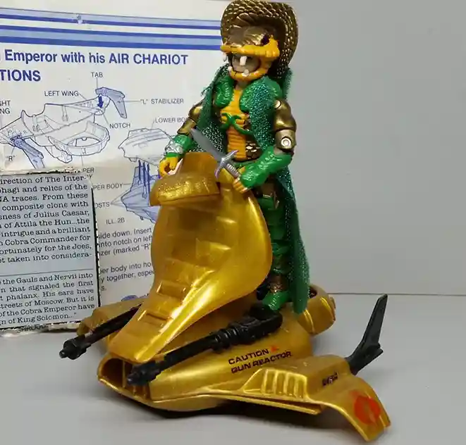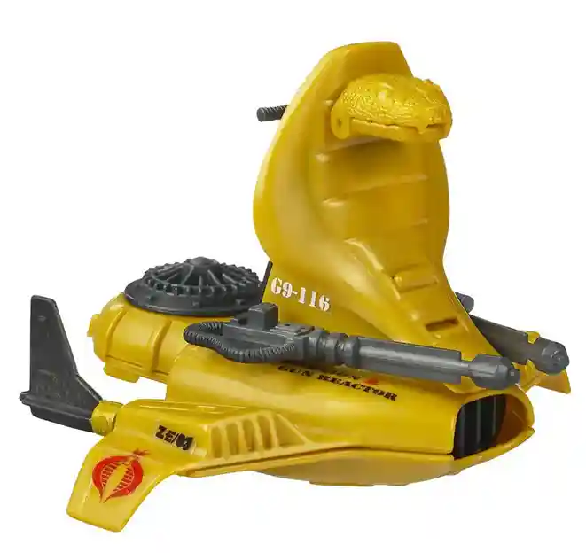 Serpentor was originally packed with an Air Chariot back in the 1980’s as he was considered a vehicle driver in addition to a leader. The Air Chariot is gold in color and has a very cool Cobra Snake head and hood design on the front of it. Serving as Serpentor’s means to get around, it was quite compact and had two forward mounted lasers on the front for protection!