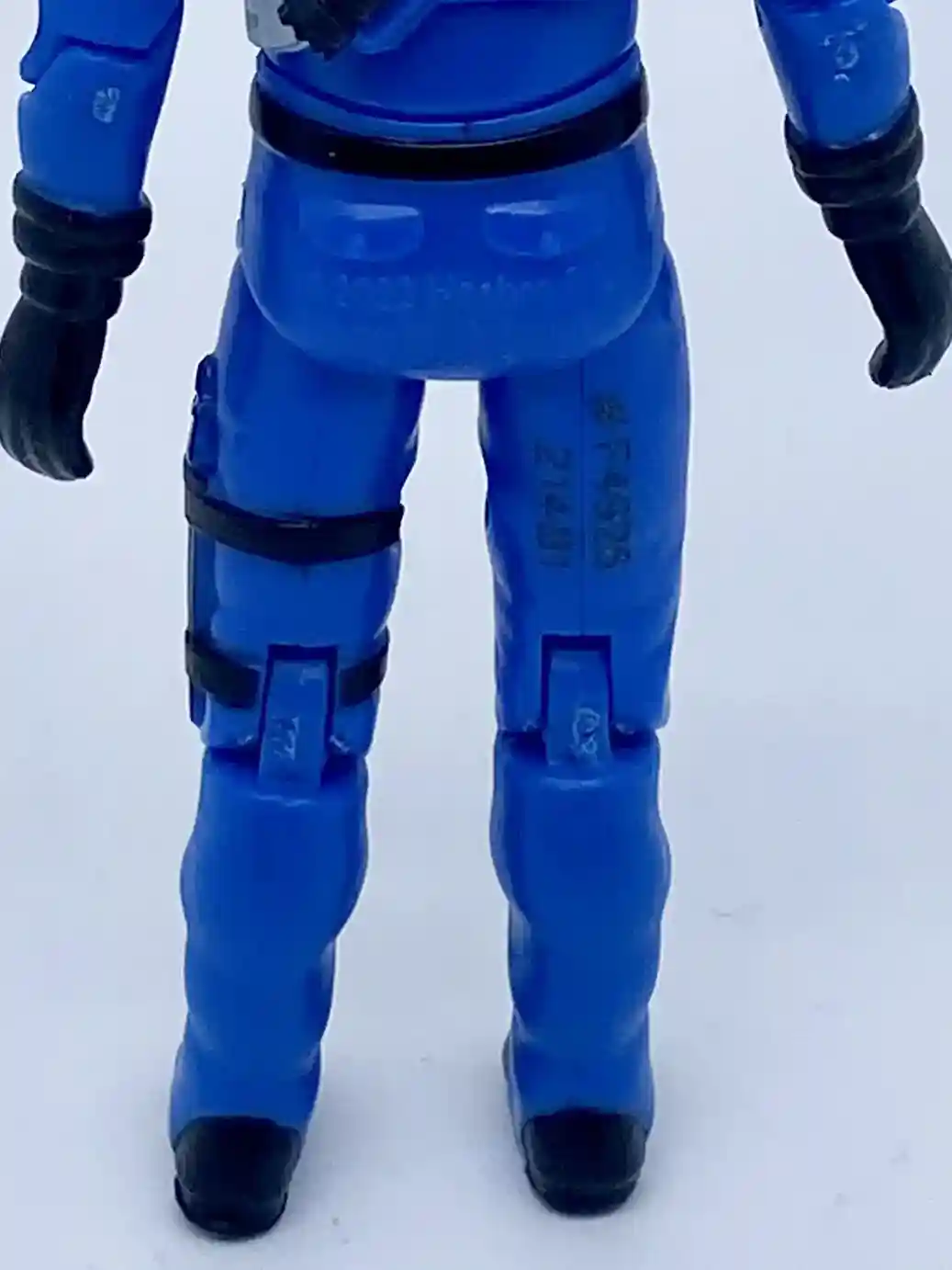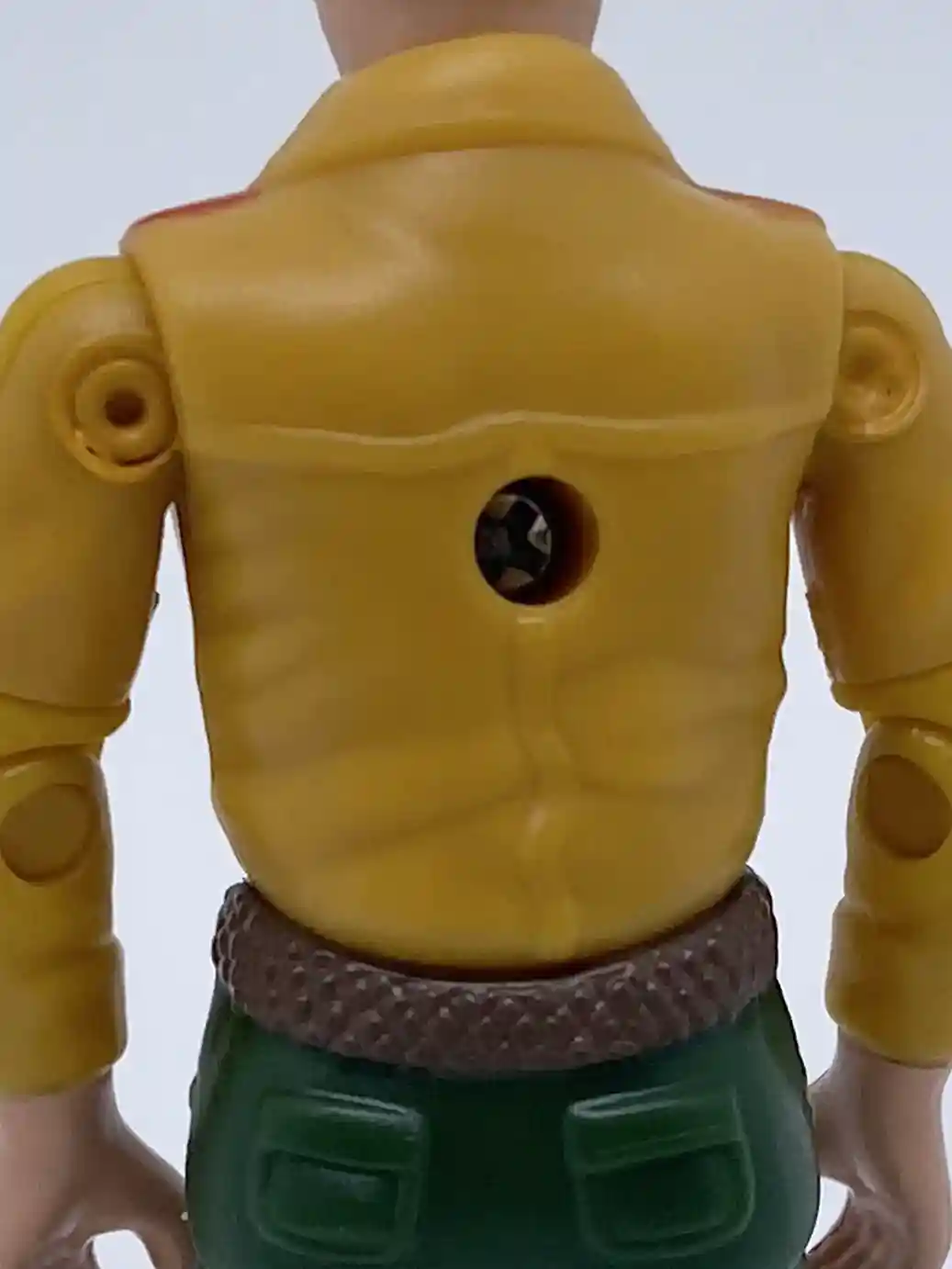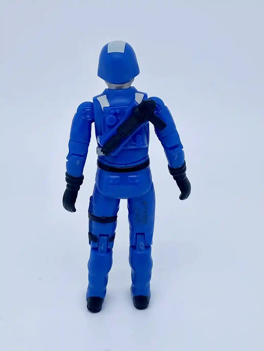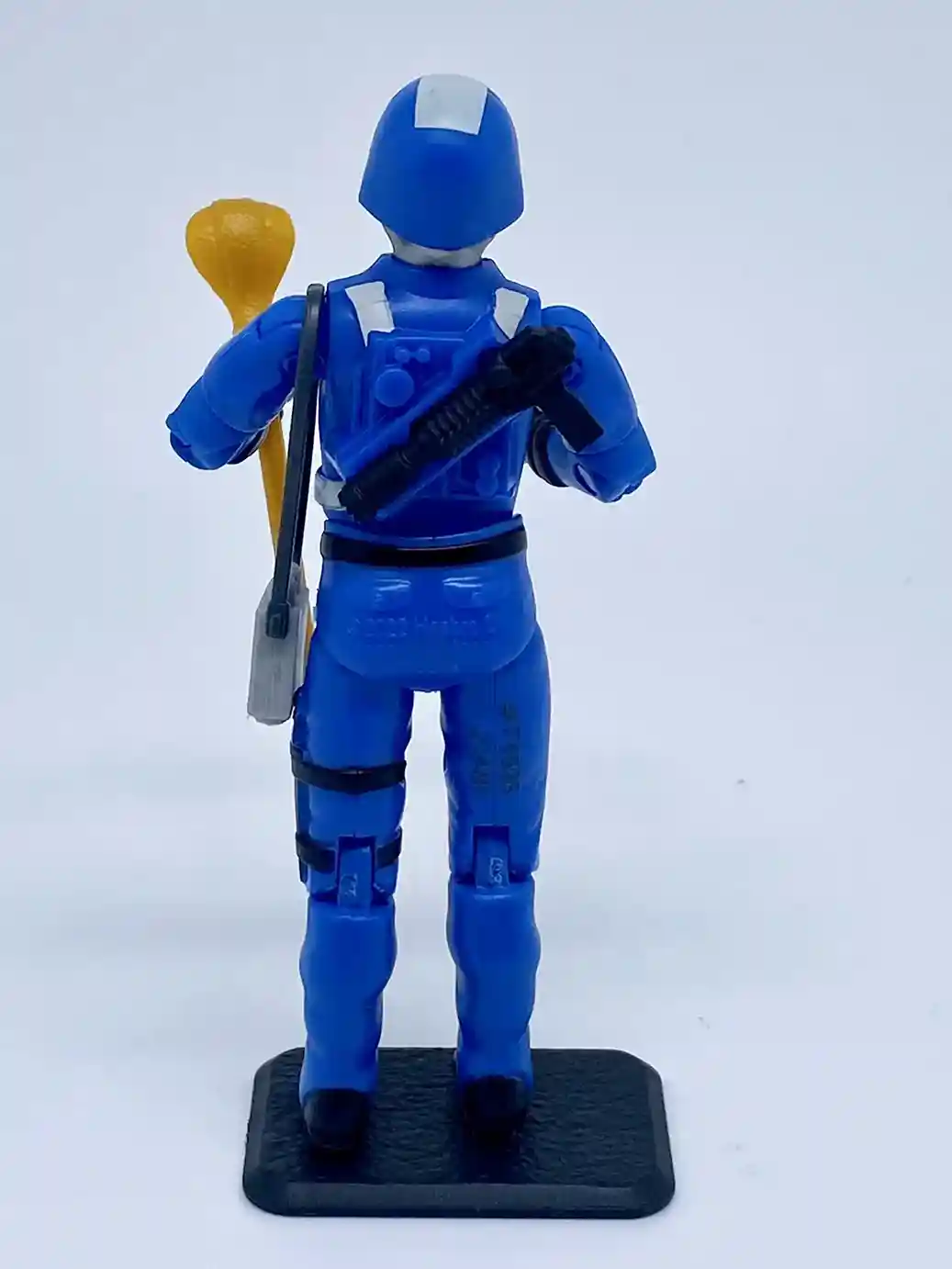 His back features the same molded hair dryer gun stow away feature as the vintage figure and has some molded accents. You can also see some white backpack straps painted on his shoulder and waist areas.
