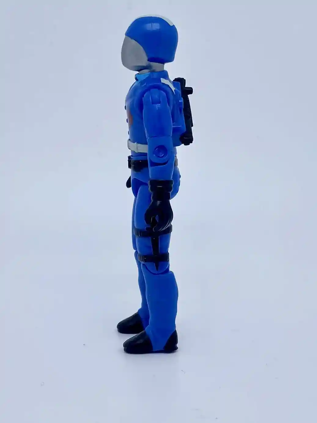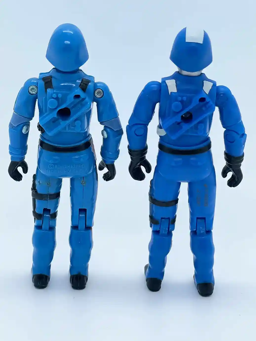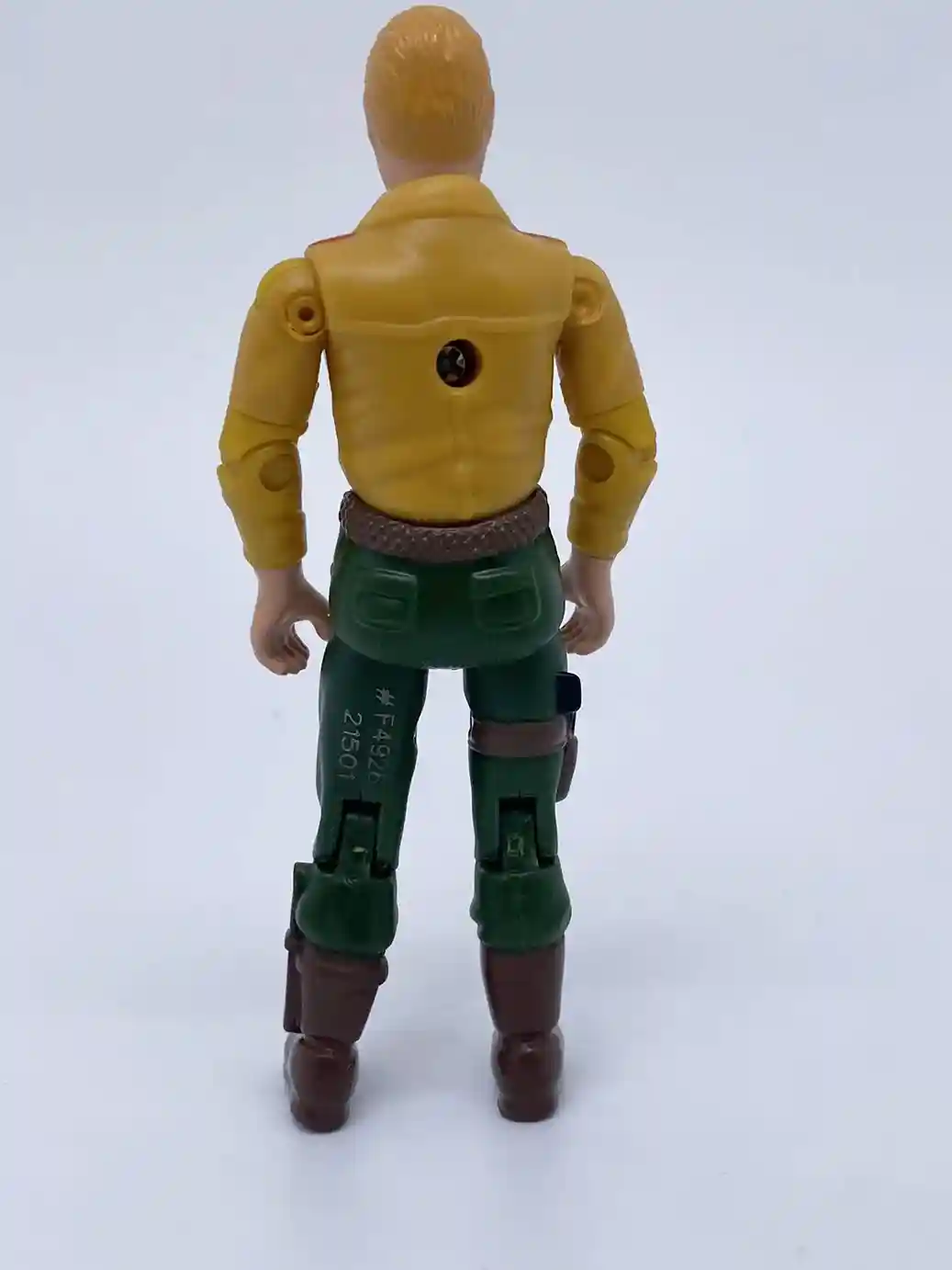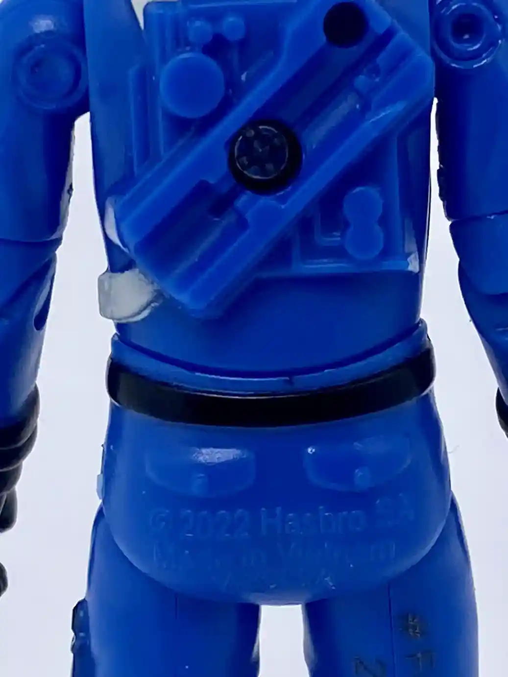 His back features the same molded hair dryer gun stow away feature as the vintage figure and has some molded accents. You can also see some white backpack straps painted on his shoulder and waist areas.