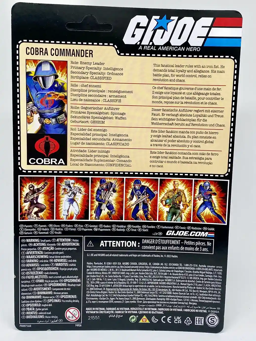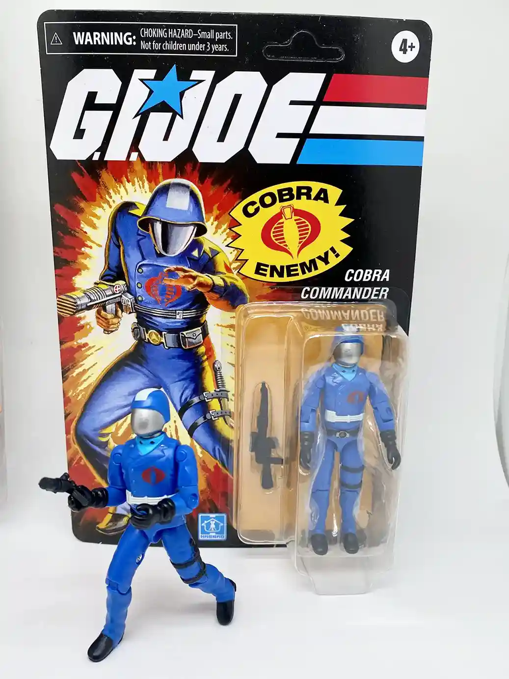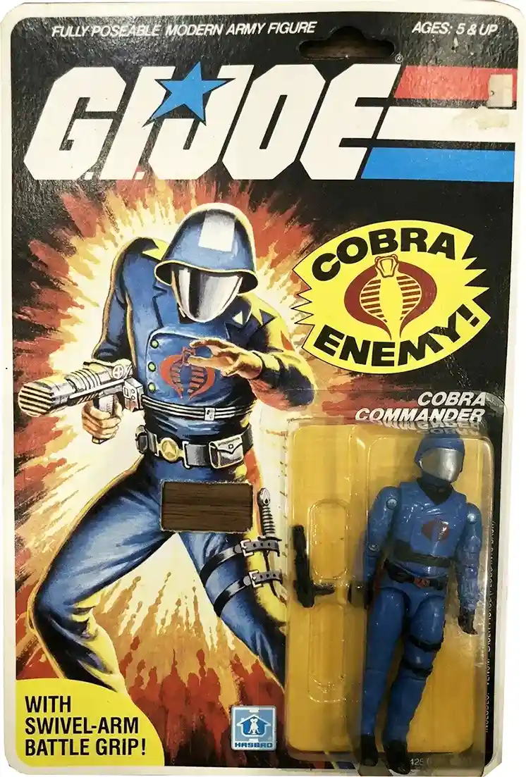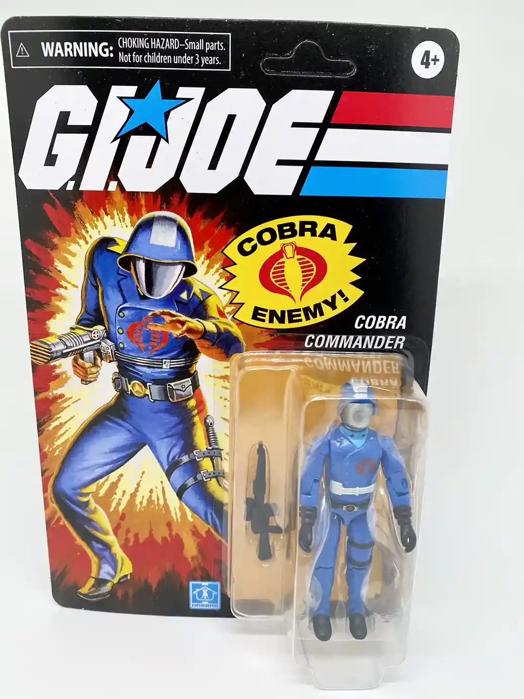 The original swivel arm version of Cobra Commander was released in 1983 as part of Wave 1.5. A re-release of the Wave 1 version, this 1983 figure included the new revolutionary swivel arm design! The 1983 Cobra Commander only included 1 accessory which was his infamous “hair dryer” gun. As you can see the new GI Joe Cobra Commander Retro O-Ring 2022 release is packaged with a larger machine gun rather than the hair dryer gun, which was an odd choice for Hasbro, as they could have easily packed the correct gun on his blister pack and put the larger rifle in the weapons cache box. The art work and logo on the new the Retro version resemble the vintage very closely and it’s hard to tell if it is the same artwork but just cleaned and brightened up. They also included the famous “Cobra Enemy” logo on the front of the package as well.