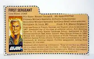 The vintage file card of course gives us much more information and back story. First the date points are the same except on the vintage file card we get to see what grades Duke completed E-8 (Master Sergeant). They also mention all the languages he was fluent in. We get to see the name of his airborne school; Fort Benning. He specialized in Asian dialects and worked with tribe men in South Vietnam. And then it includes a quote after he turned down his commission. So it was neat to see all this additional deep dive information on the characters that the new file cards just don’t give us. But we get the basic information on them, so at least that’s pretty good.